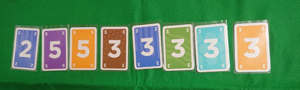 では得点計算の方法を説明します。同じ数字または同じ色が5枚以上あるときは0点とします。あと同じ数字は2枚以上あっても1枚として数字をカウントします。下の写真だと、3が5枚以上なので0点・5が2枚なので5点・あと2が1枚で2点の計7点です。
