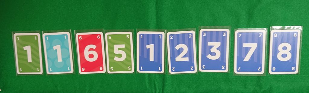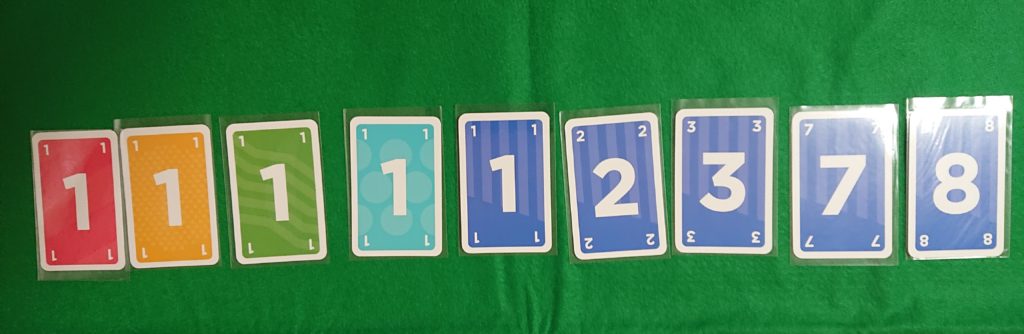 カードは7色で各色1~8までの数字が書いてあります。各プレイヤーに9枚ずつ配り、5枚を表にして並べます。下の写真のようになります。