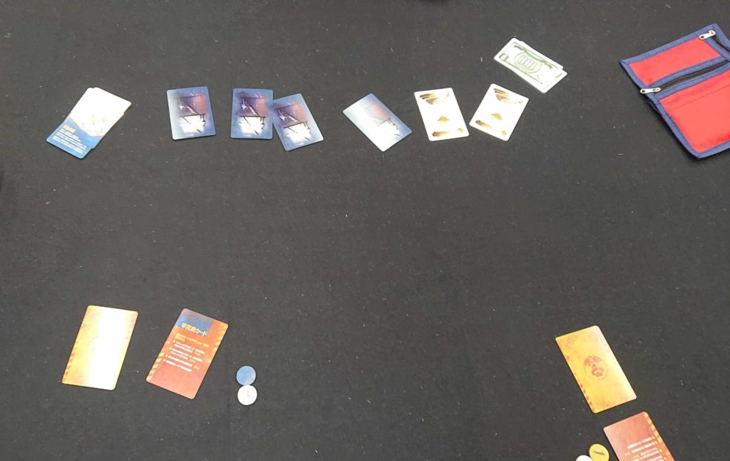 次にプレイしたのが、「ウォレット」最大人数の7人でやりました。闇カジノから警察の手入れが入る前に、できるだけお金を集めていき、かつ警察に捕まらないようにするカードゲームです。お金が多い順に勝利チップが多くもらえます。それを3ラウンド繰り返した総合勝利チップ点が多いプレイヤーが勝ちです。