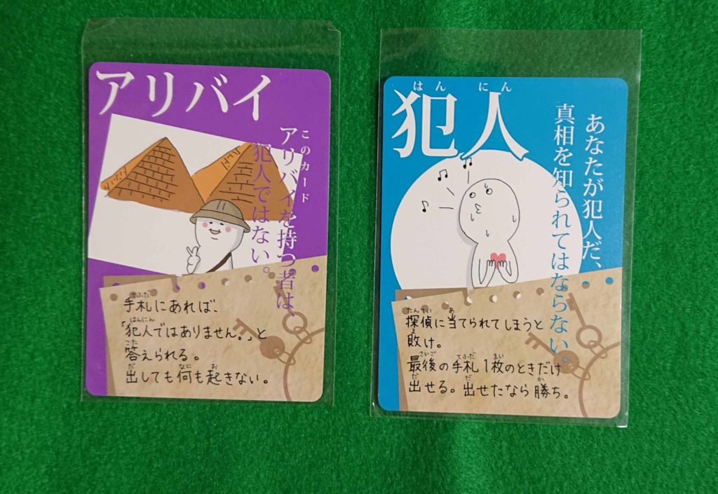 また、犯人なのに「犯人はおまえだ!!!」と指名されても「いいえ違います」と答えていいカードもあります。下の写真の「アリバイ」カードがそれです。