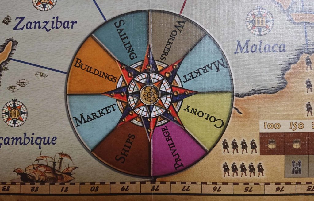 あるプレイヤーが、船をどんどん作って航海で得点しようと思った場合、手番で航海ばかり選べるのかというと実はそうではありません!!下の写真のように、前の手番で選んだ所から時計回りに3つ先までの行動しかすることが出来ないのです。これがまた悩ましさを一層大きくしています。
