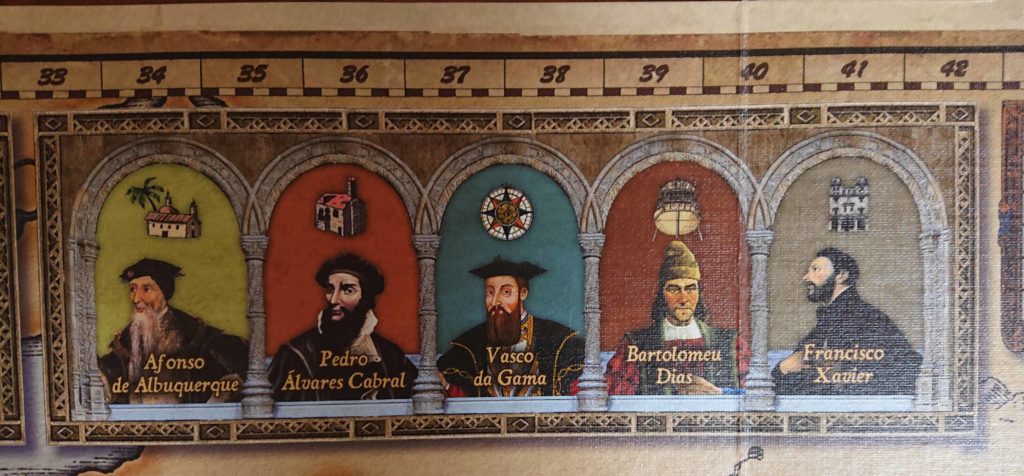 - 恩恵(PRIVILEGE) 下の写真の人物のところにある1点~2点の恩恵タイルを取ることが出来ます。取るためには労働者を1人減らします。恩恵タイルはゲームの勝利点となる航海・植民地・工場・造船所・教会の得点を上げることが出来ます。(例えば航海の恩恵タイルの場合は、【恩恵タイルの得点×未知の海域の探索チップの数】となります。)