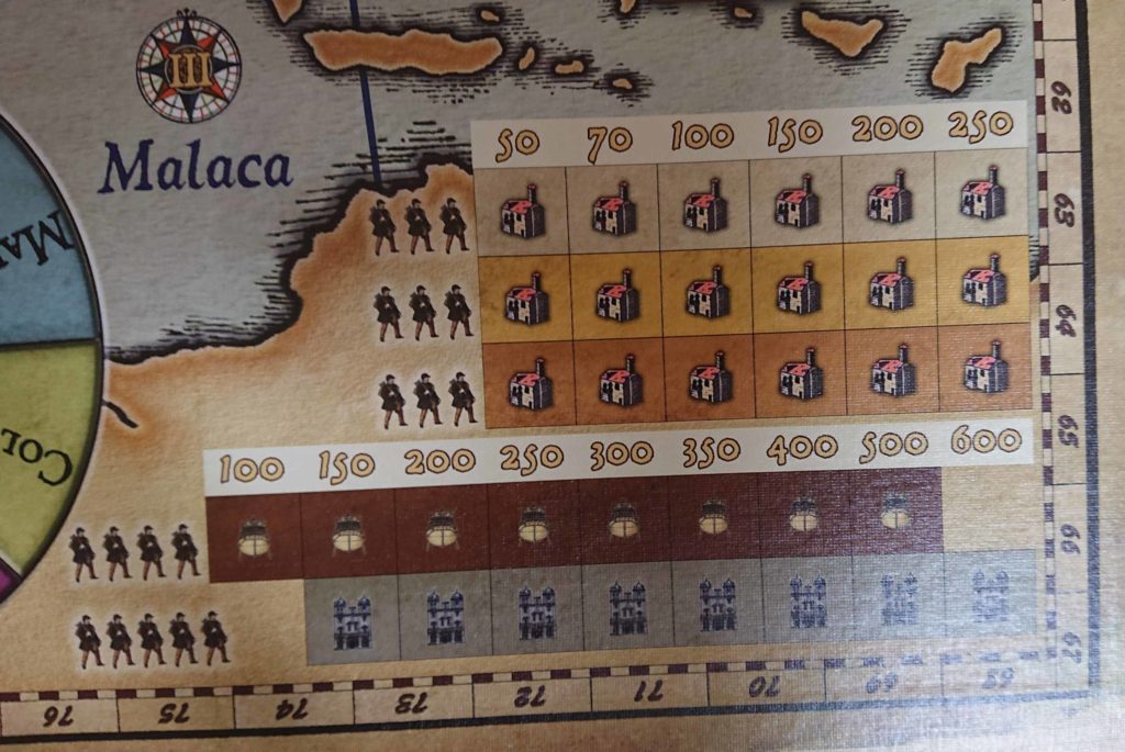 - 建築(BUILDINGS) お金を払い工場・造船所・教会を建築することが出来ます。左側から買っていきます、値段は下の写真の通りです。ただし、それぞれ3人・4人・5人の労働者が必要です。工場・造船所・教会の数は有限です。