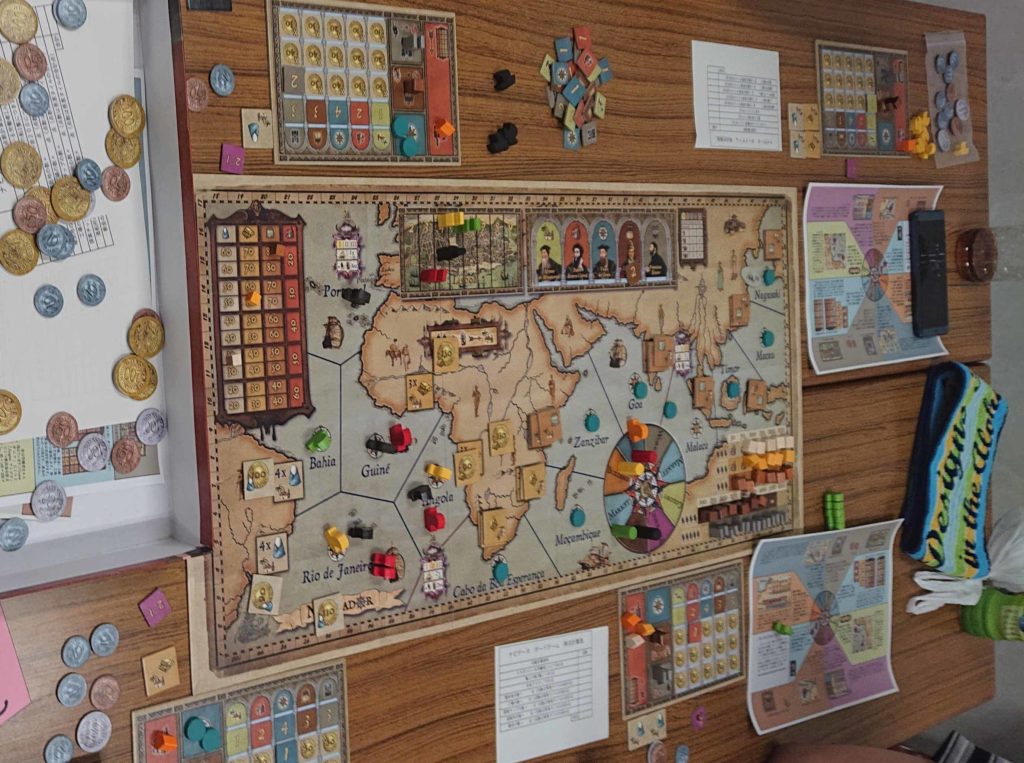 下の写真がゲームボードです。世界地図(アメリカ大陸はちょっとだけですが)が描かれています。各プレイヤーは、航海・植民地・工場・造船所・教会の5つの分野で勝利点を稼ぎ勝利を目指します。