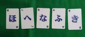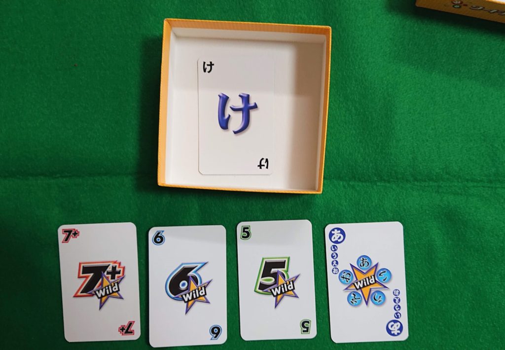 下の写真のように1人が5枚のカードを手札にし、残りは山札とします。カードにはひらがなが1文字書いてあります。ゲーム開始の時に山札から1枚カードを箱のなかに表にして入れます。