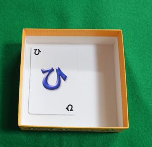各プレイヤーは「ひ」で始まって手札のひらがなで終わる言葉を言ってそのカードを箱に入れます。例えば上の例では、「ひこうき」と言って「き」のカードを入れます。すると下の写真のようになります。