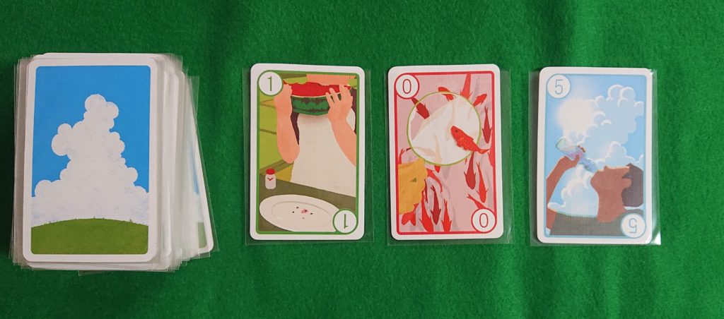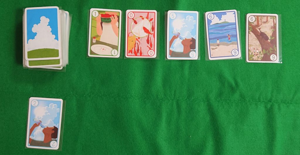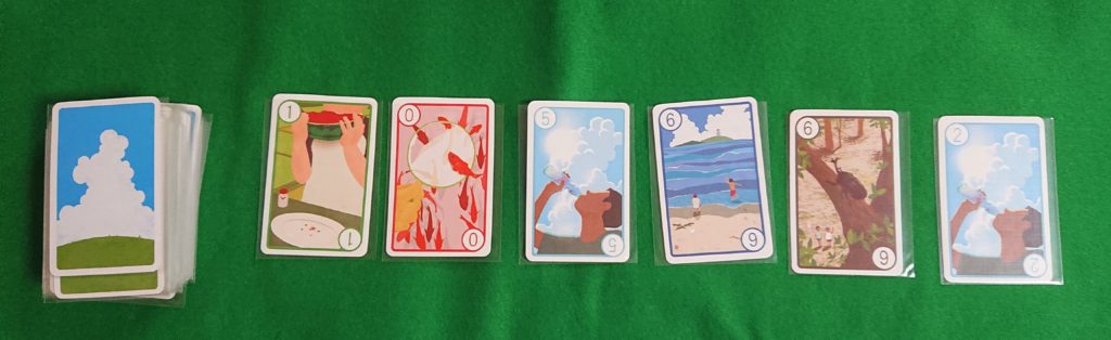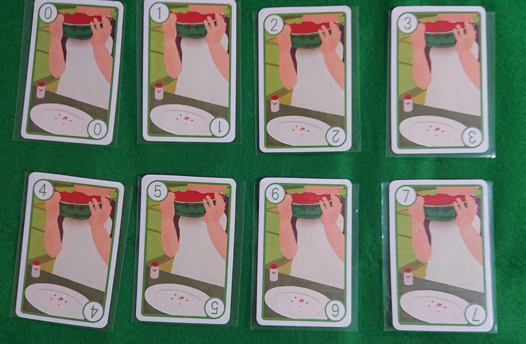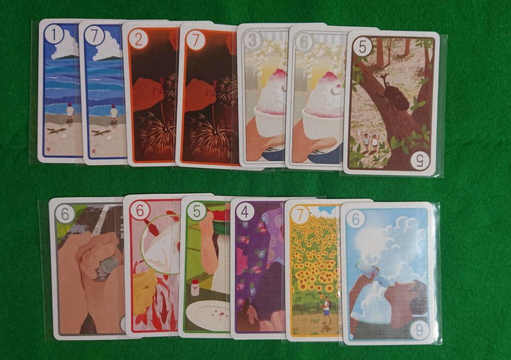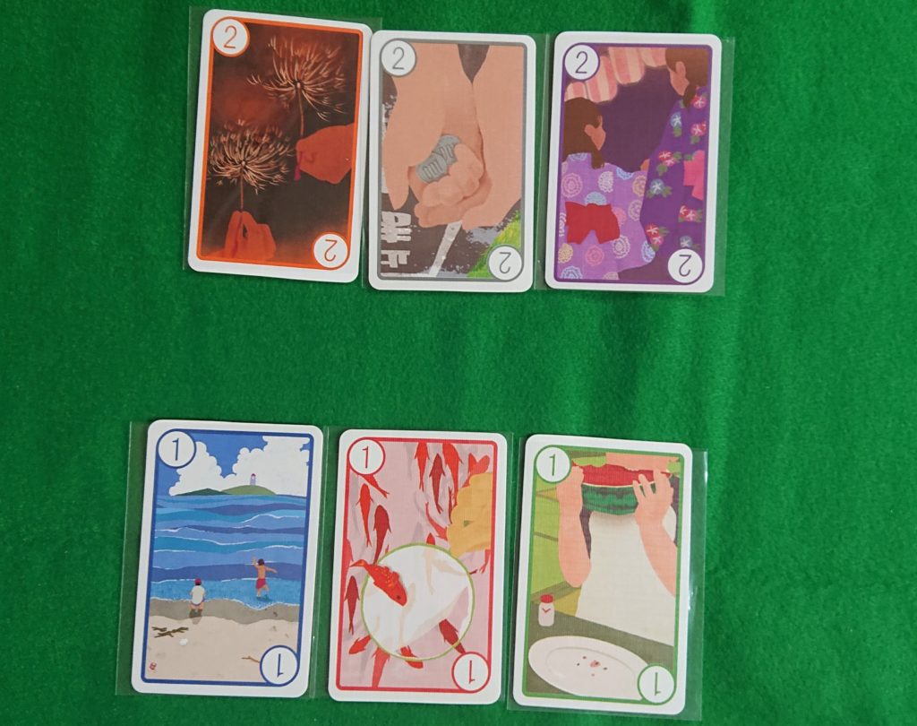 ゲームシステムも、高い点数のカード(4点・5点・6点・7点)は手札として集め、低い点数のカード(0点・1点・2点・3点)は3枚セットとして場に出すというように、すべてのカードにきちんと価値があるところがすごく良いと思いました。同じ「なつのたからものカード」は0点になるので、それをうまく3枚セットとして出していくという考え方もありますよね。