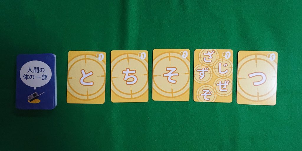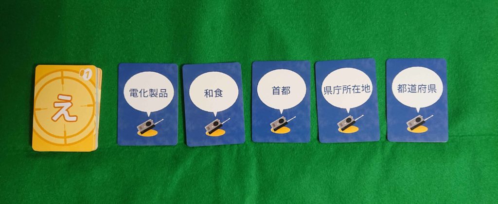 今度は逆に、文字カードを山札として、お題カードを5枚めくり置きます。この状態からスタートします。