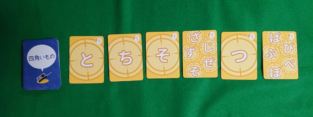 文字カードを1枚めくりお題カードの横に新たに置きます。各プレイヤーは「つ」で始まるお題に合った言葉を早く言います。
