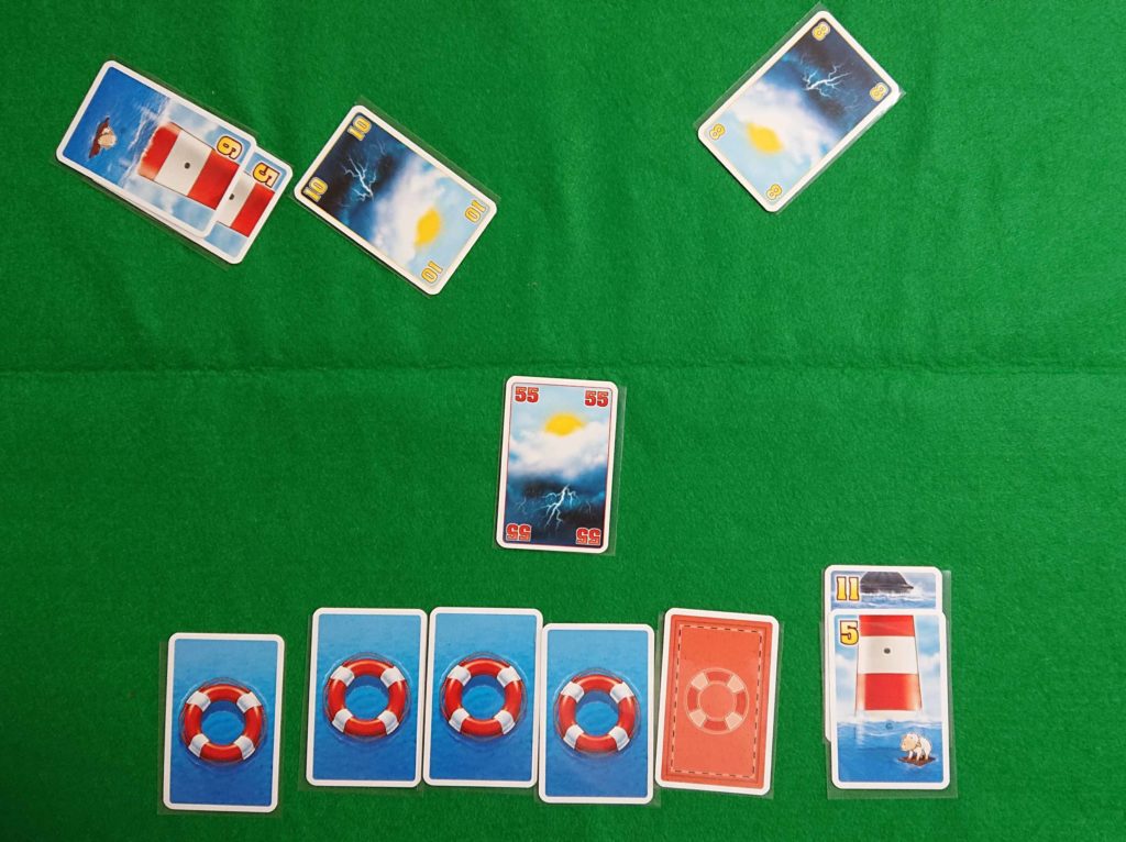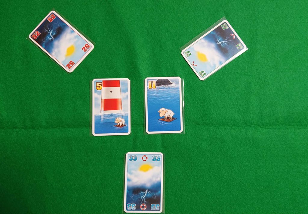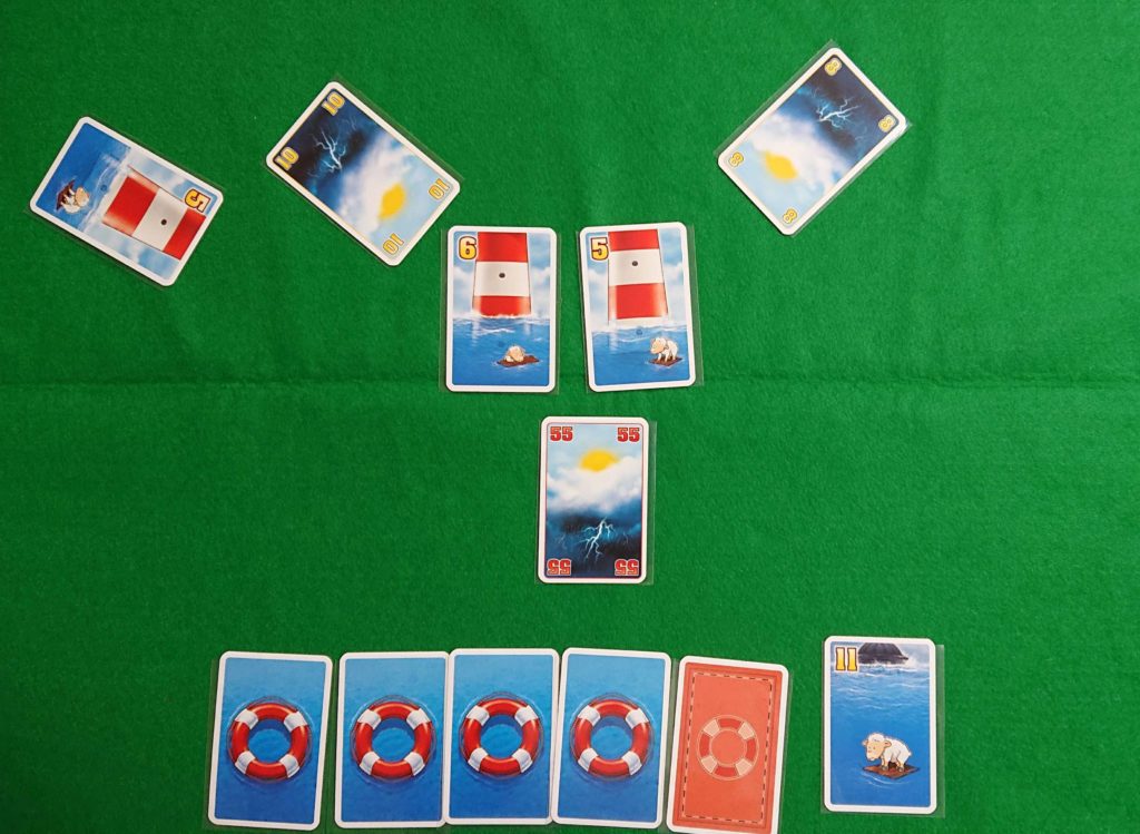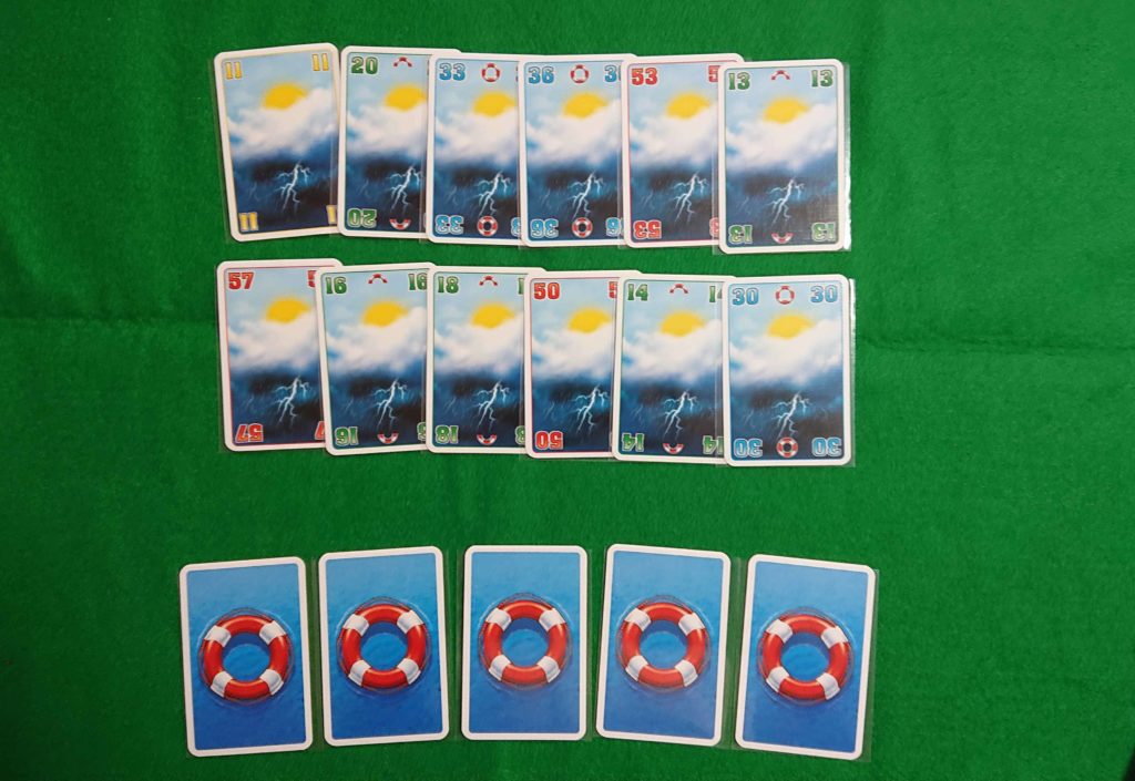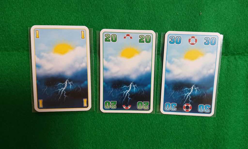 天候カードの小さい数字と大きい数字には浮き輪が描かれていません、手札カードを配られたとき、中央カードが多ければ浮き輪が多く、両端のカードが多ければ浮き輪の数が少なくなっています。これは当然小さな数字の場合は、水位カードを受け取りにくいし、大きい数字は低い水位カードを取りやすいので、各プレイヤーのバランスが調整されていますね。