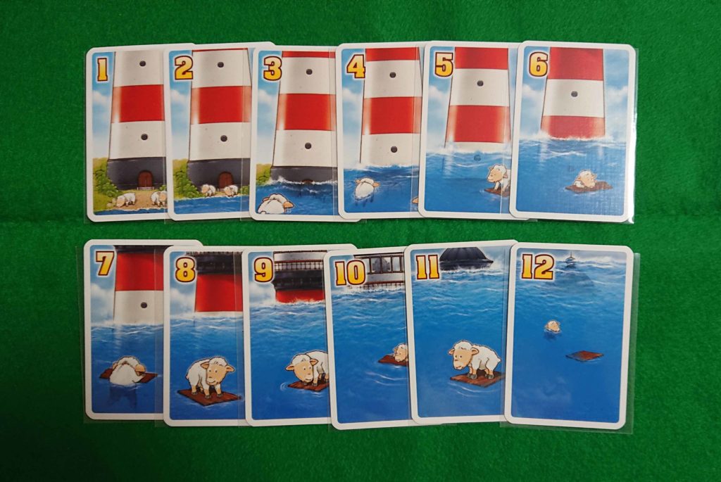 下の写真が「水位カード」です。1~12の数字があり各2枚ずつの計24枚あります。数字が大きいほど水位が高いと言うことです。24枚のカードをよくシャフルし山札として置きます。