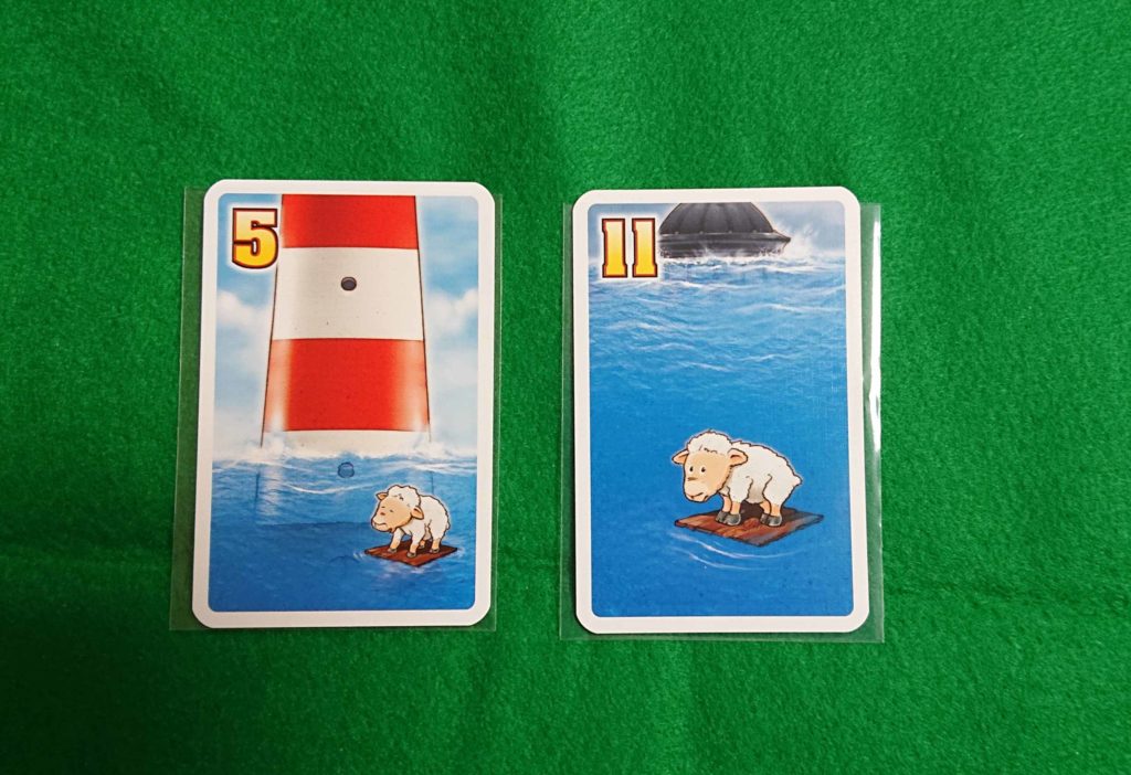 その後各プレイヤーの水位カードを比べ、一番水位カードの数字が大きいプレイヤーは自分の前の浮き輪カードを1枚裏にします。先程の場合は水位カード11を獲得した下のプレイヤーが浮き輪を1個失います。(一番高い水位カードが複数あるときは、その各プレイヤーは浮き輪を1個失います。)