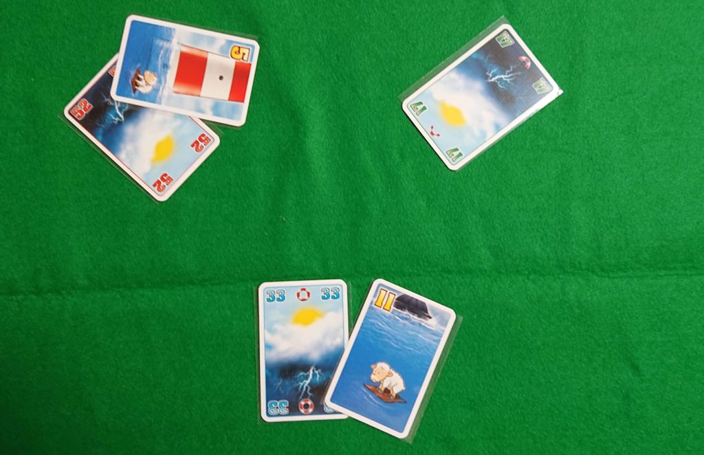 一番天候カードの大きい数字のプレイヤーは、数字の小さい方の水位カードを取り自分の前に表にしておきます。次に天候カードが大きな数字のプレイヤーは、大きい方の水位カードを取り自分の前に表にして置きます。