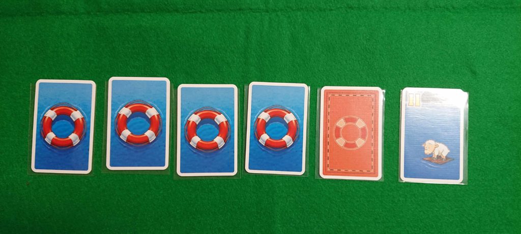 各プレイヤーに12枚の天候カードを配ります。そのとき各プレイヤーは、手札の天候カードの上の浮き輪の数だけ、自分の前に浮き輪カードを並べます。