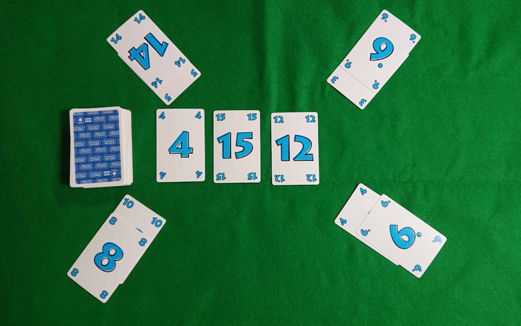 次に、残りの4人のプレイヤーはさっき出したカードの上に、下の数字が見えるように新たにカードを出します。出したカードの合計が一番小さい数字のプレイヤーが場の一番小さな数字のカードを獲得します。