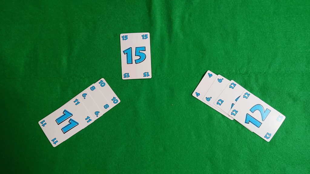 下の写真の場合左のプレイヤーが合計35右のプレイヤーが合計34なので、左のプレイヤーが15の数字カードを獲得します。