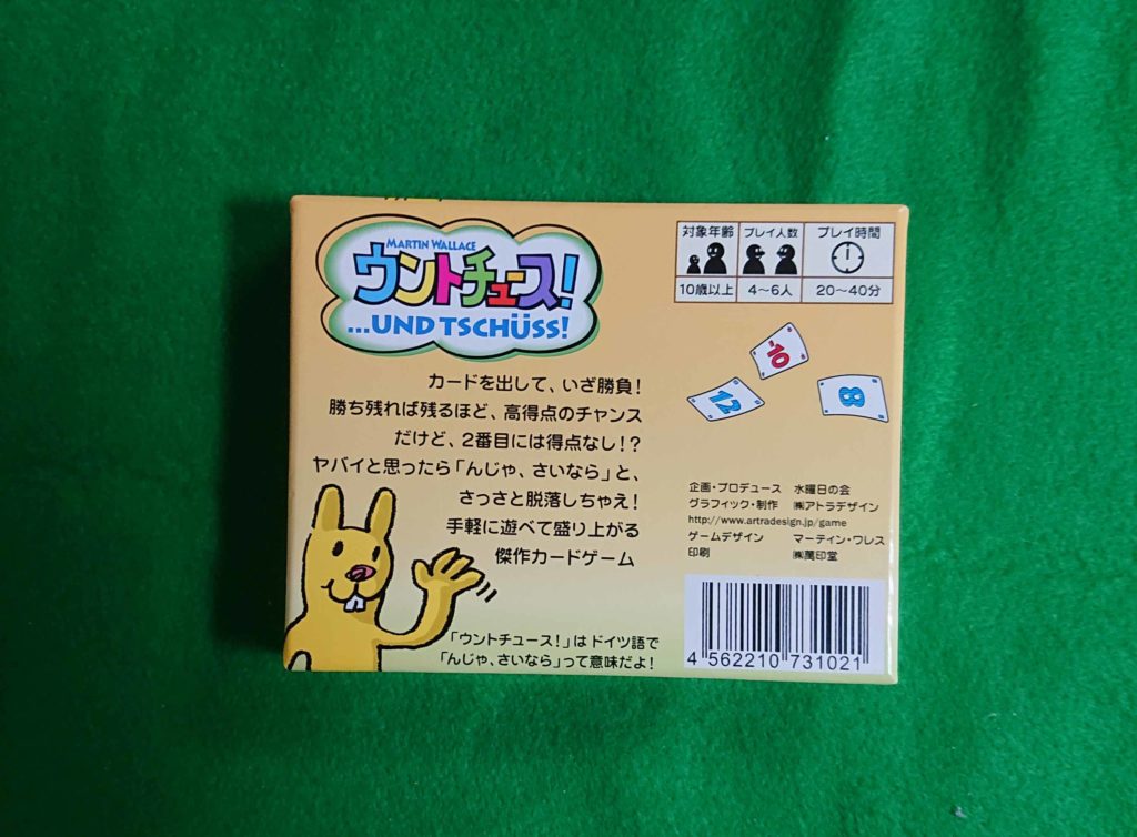 このゲームカードを獲得した時に、「チュース」といって抜けて下さいと指示が書いてあります。その掛け声だけでちょっと笑ってしまいます。2位の人だけがカードを取れないというちょっと変わったトリックテイキング系のゲームです。前紹介した「2位じゃダメなんですか」というゲームの反対のゲームですね。