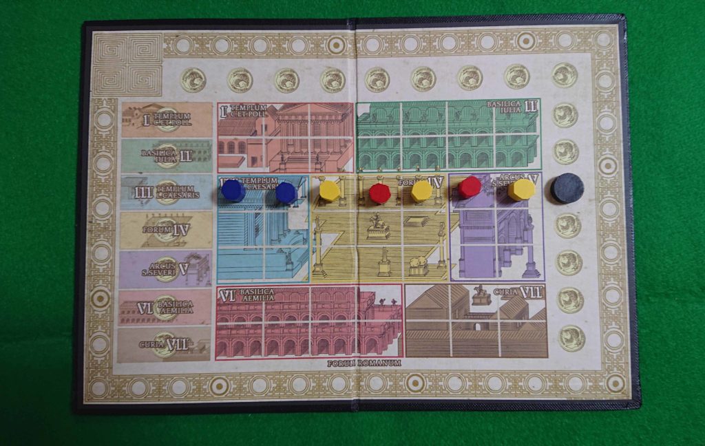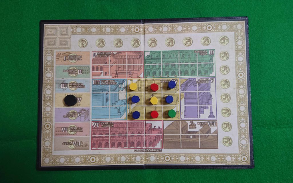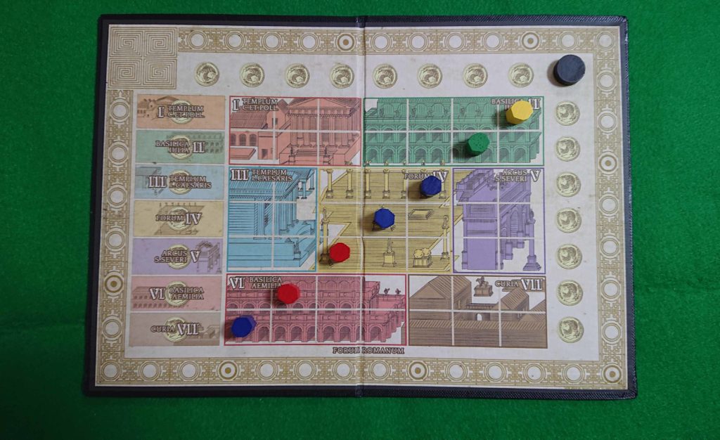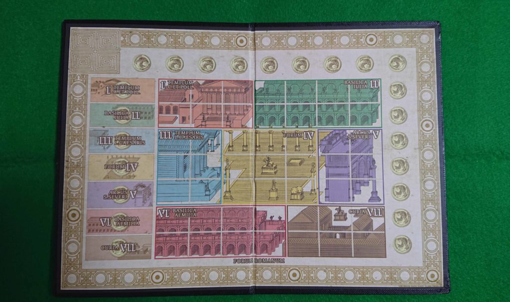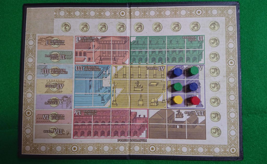 下がゲームボード、フォルム・ロマヌムの街を表しています。街は7×7の49の四角のマスになっていて、マスは7の色別の区画に分かれています。周囲は勝利点を記録するための点数表、その内側が決算マーカーを置く場所です。