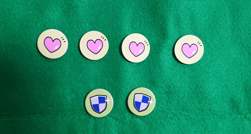 下の写真の上段の列が、ライフチップいわゆる生命力です。最初4枚あり、これが無くなるとゲームに負けます。下段の列がカウンターチップで、魔法を無効化するチップです。