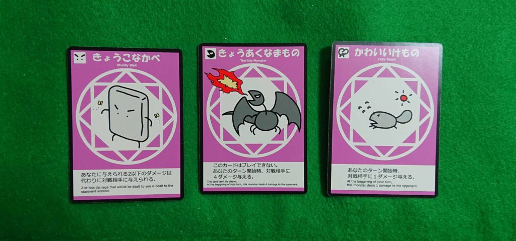 カードは16枚しかありません。下の3枚が魔物カードです。左の「きょうこなかべ」はダメージを反射する魔物です。真ん中の「きょうあくなまもの」は、右の「かわいいまもの」を変身の呪文カードで変身させることによってのみ召喚出来ます。魔物は場に出されている間、常に相手にダメージを与えます。