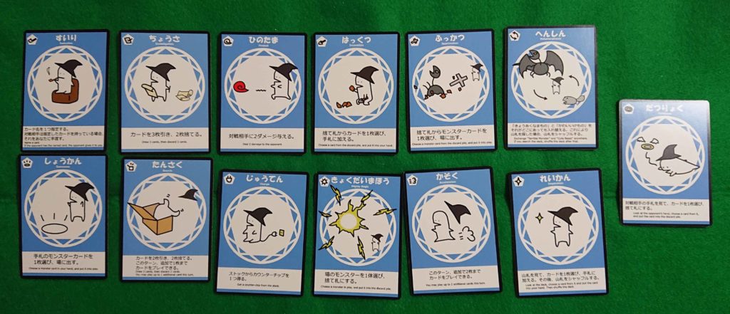 残りの13枚が呪文カードです。相手の手札を捨てさせたり、捨て札からカード取ってきたり、追加でカードを2回プレイできる、場にある相手の魔物を捨てさせる、などいろいろな効果を持ったカードがあります。