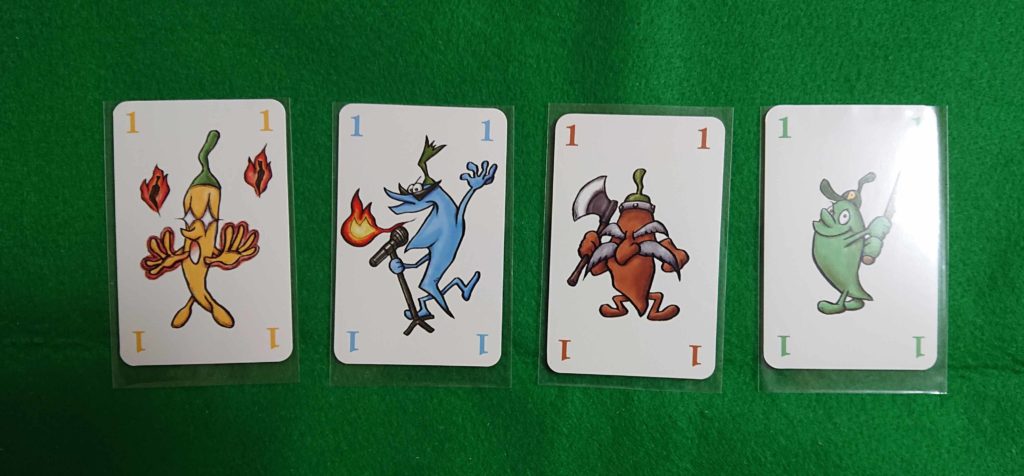 もし、手札に同じ色のカードがない場合は、好きなカードを出して構いません。当然自分の前のペッパーカードを出してもいいのです。この場合も最初に出した色のカードで1番大きい数字を出したプレイヤーがカードを引き取ります。