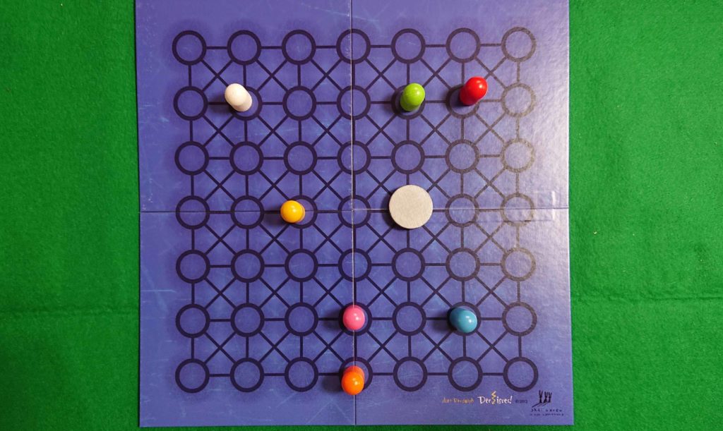 銀の丸い駒を置いていないプレイヤーが、最初に7色のコマの1つを1マス動かします。コマの動かし方は、銀色の駒に近づくように動かさなければいけません。