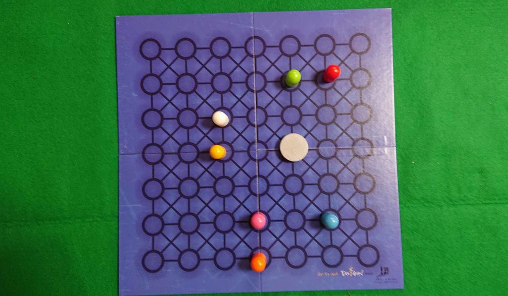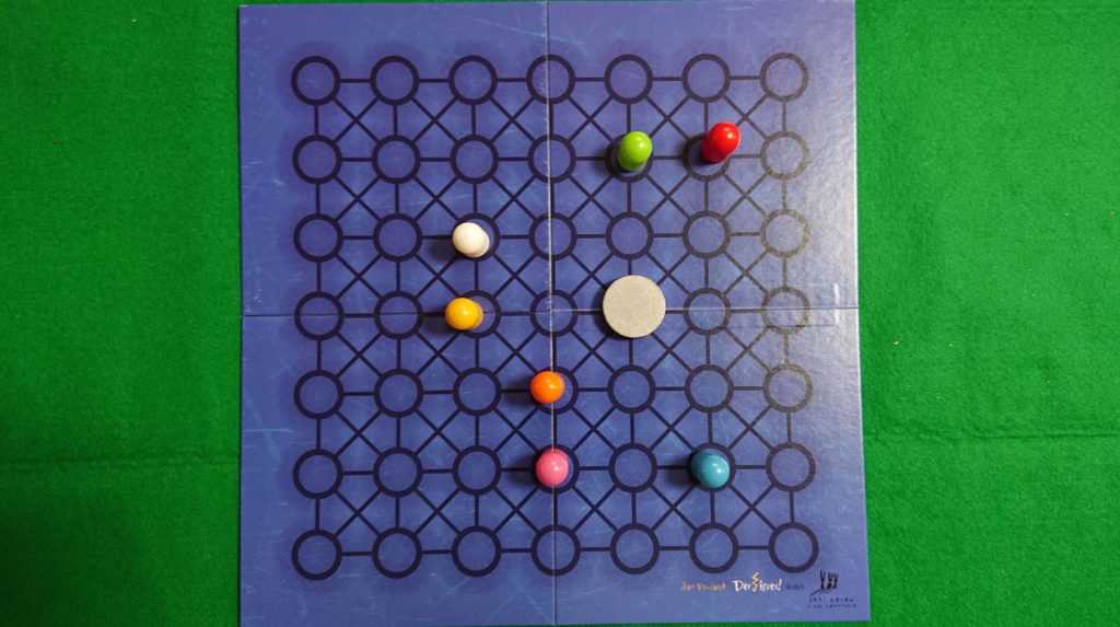 7色のコマをランダムにゲームボード上に置きます。プレイヤーは、銀色の大きい丸い駒を、7色のコマの隣ではないところに置きます。