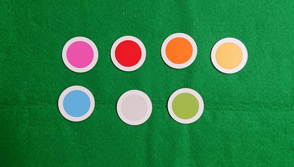 下の写真の7色のチップが各プレイヤーごとにあります。各プレイヤーは1色を選び、相手に見えないように裏向きにして自分の前に置きます。