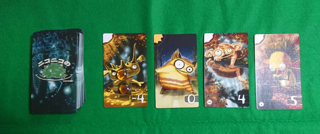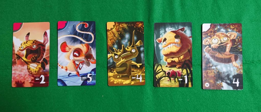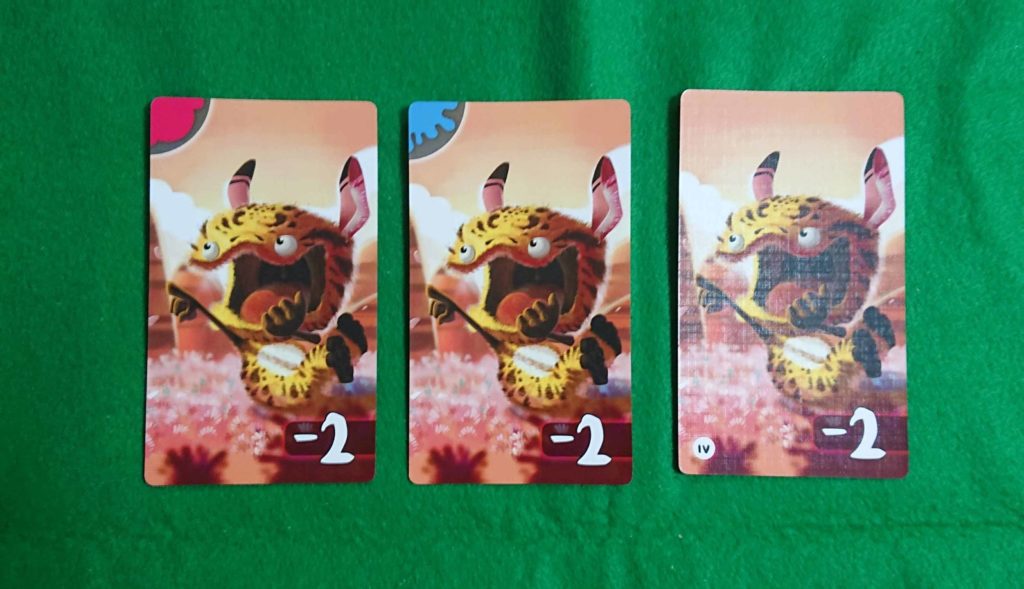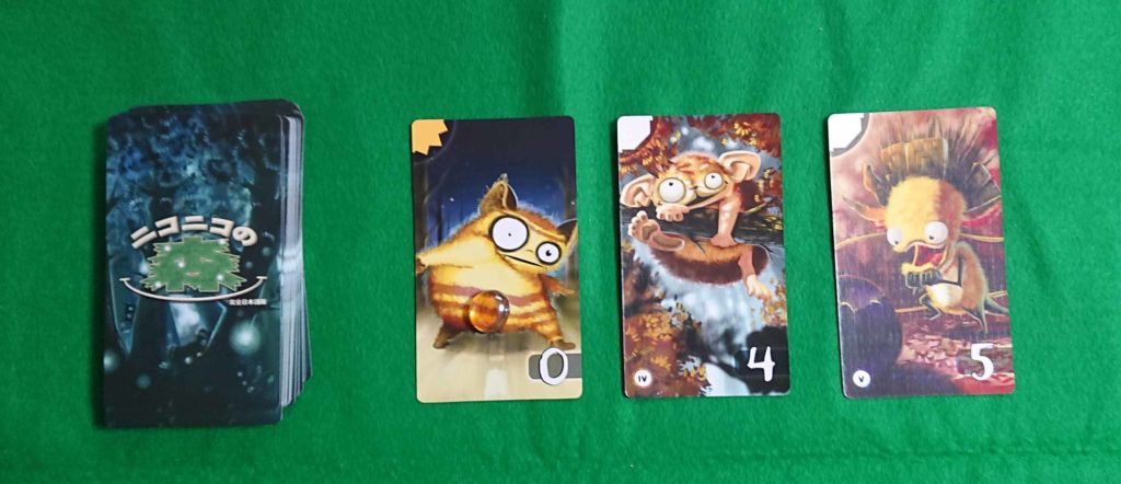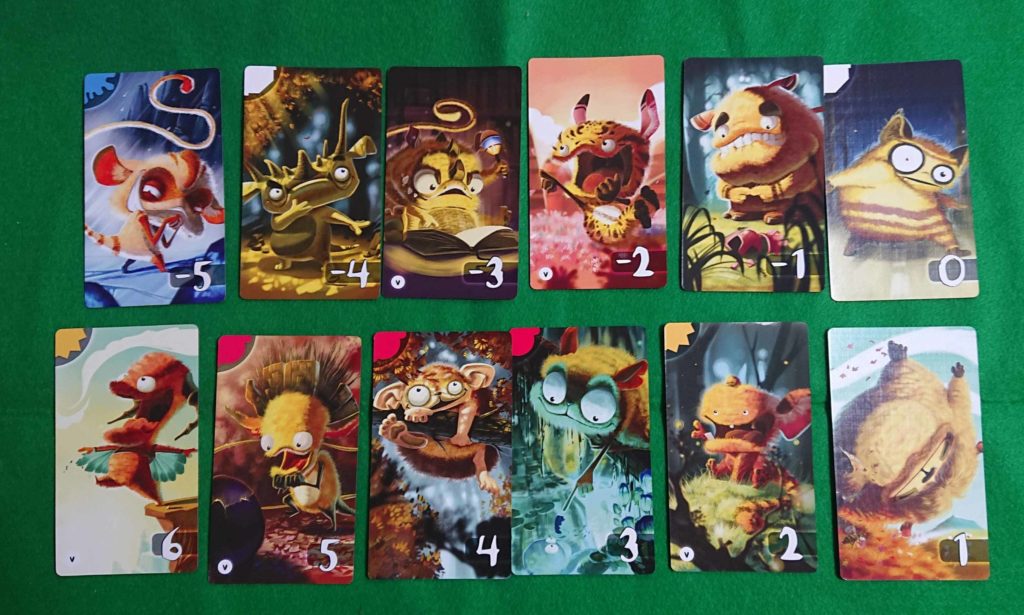自分が欲しくないマイナスのイキモノカードの上にホタルを載せて、自分は取らないで他のプレイヤーに押し付けるところは「ゲシェンク」というゲームと似ています。同じ色のイキモノカードを取ると得点にならないところも似ています。(ゲシェンクは連続した数字ですが)逆に、カードを取りたい時でも上にホタルが載っていないと取れない場合があるので、そこは異なるところですね。