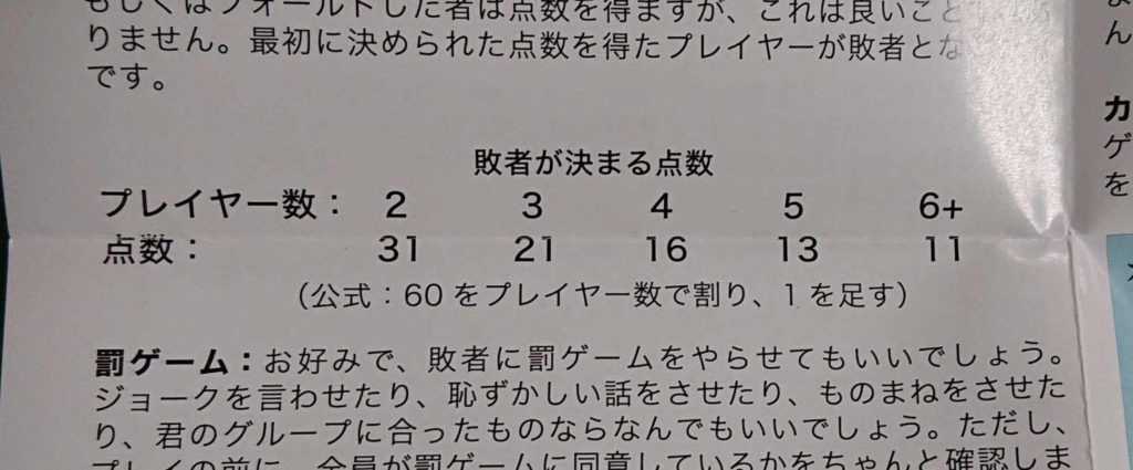 各プレイヤーの獲得したカードの数字の合計得点がある得点を超えたらゲーム終了です。(下の写真)