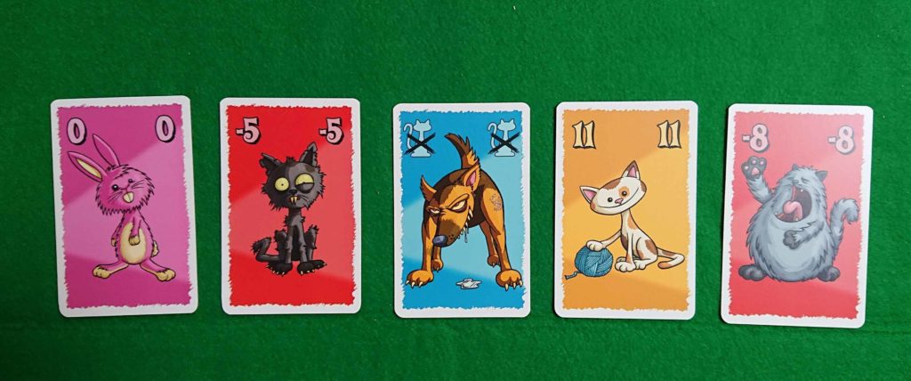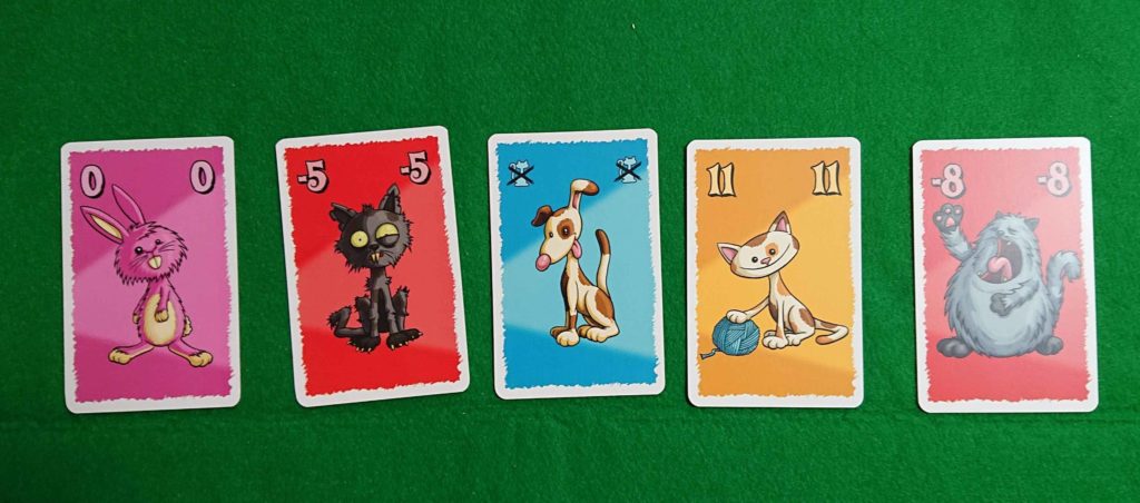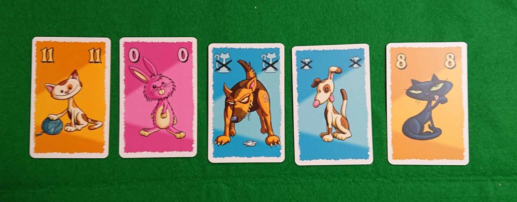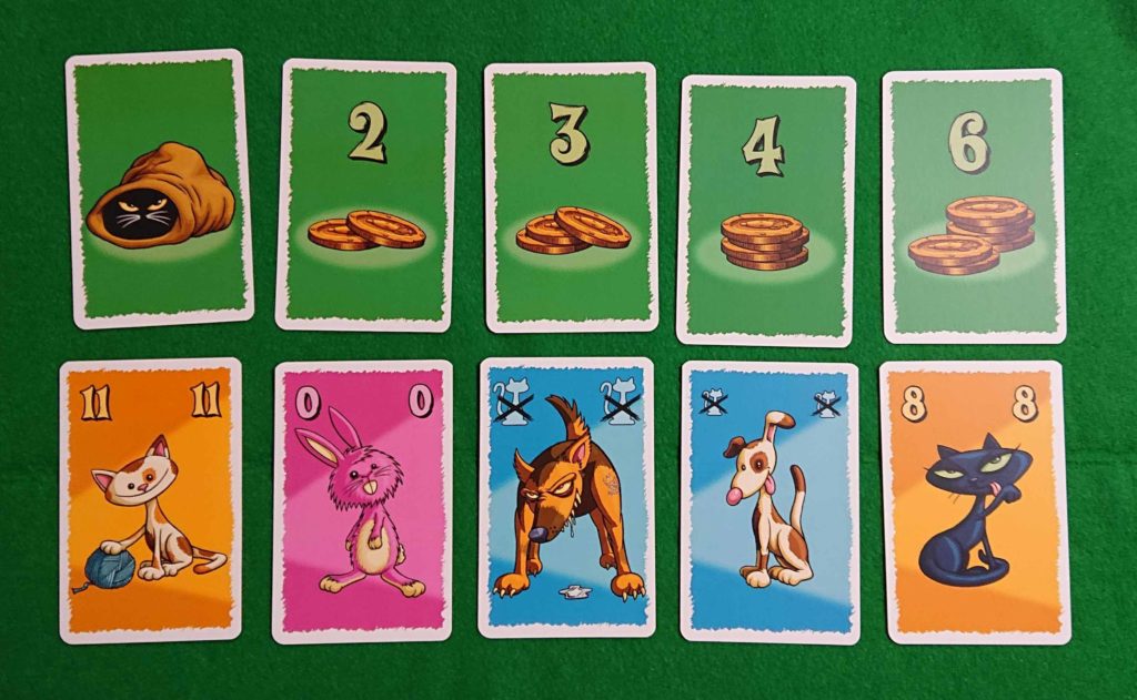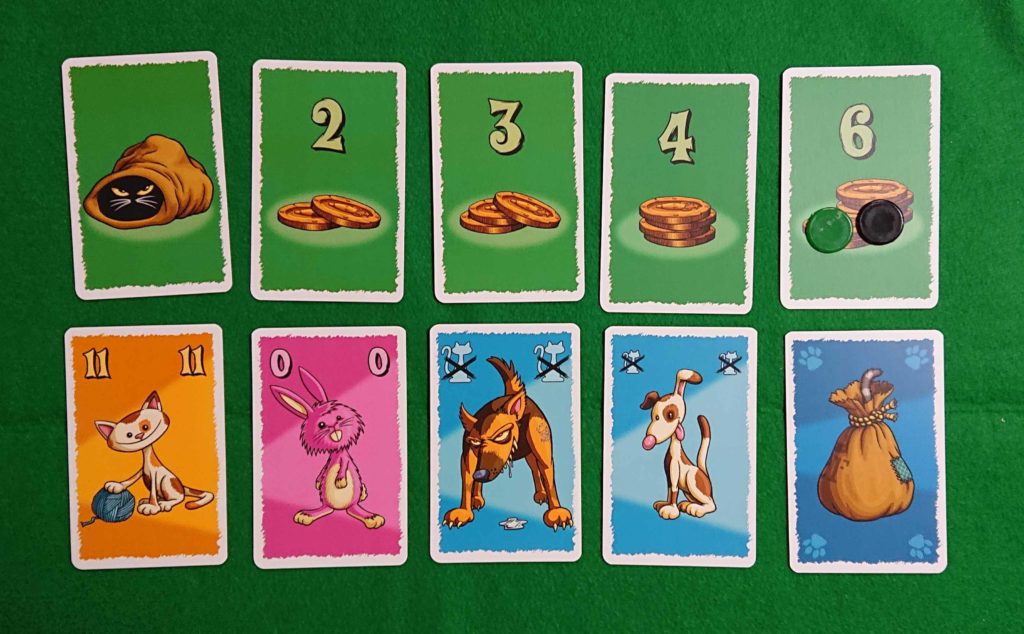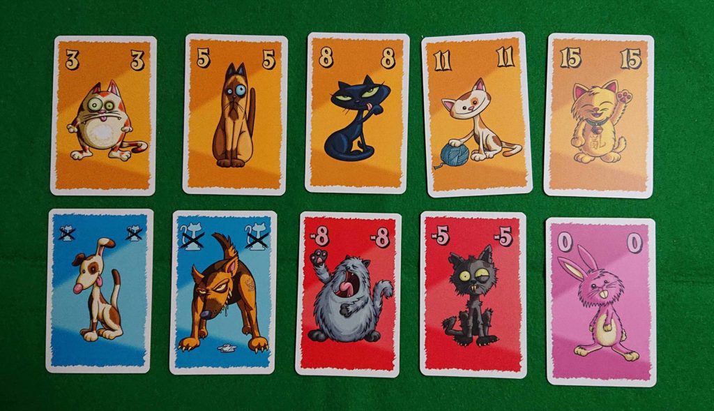 下の写真が。各プレイヤーに配られる10枚のカードです。猫とウサギの左上に描いてある数字が、そのカードを獲得した時の得点です。犬(青色)は特殊な働きをするカードです。