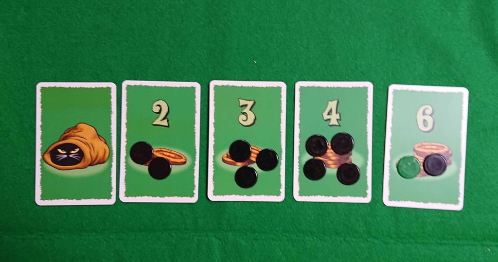 1人のプレイヤーがパスすると、下の写真のように、パスしたプレイヤーが左から2枚目のカードを表にします。残り4人のプレイヤーが同じように競りを続けるかパスするかを繰り返します。このばあいも、パスしたプレイヤーが場にあるコインと3の上にあるコイン3個を受け取り、ラウンドから抜けます。