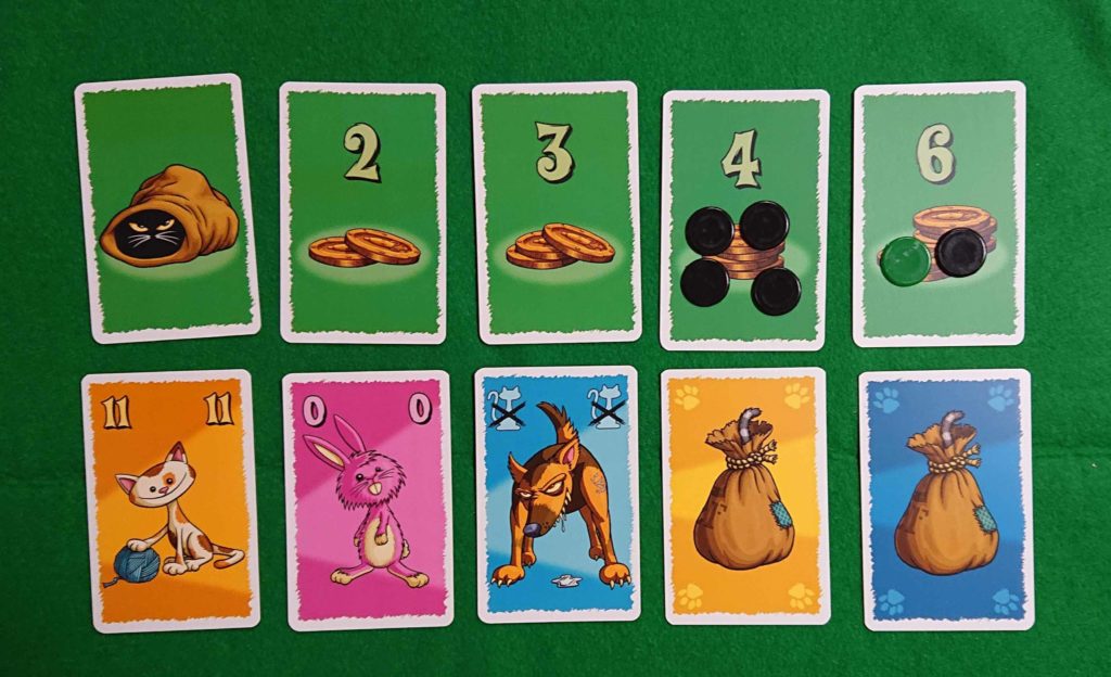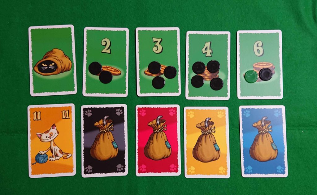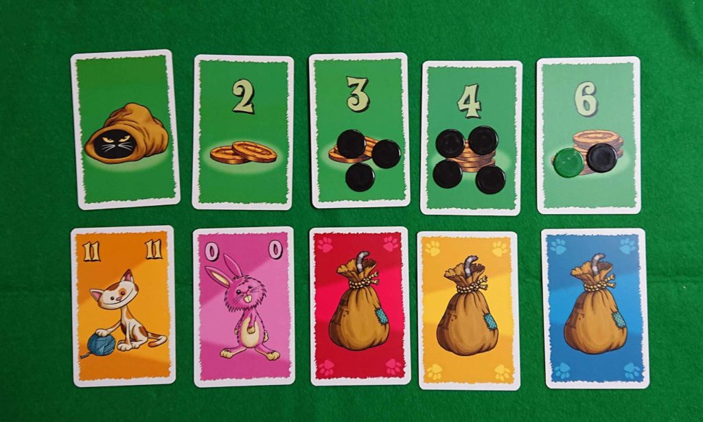 なかなか面白いカードゲームです。競りのゲームは相場がわからないので、ゲーム初心者にはやりずらいゲームであるという印象がありますが、この「袋の中の猫フィロー」は競りゲームの初心者の方でもわかりやすいゲームです。
