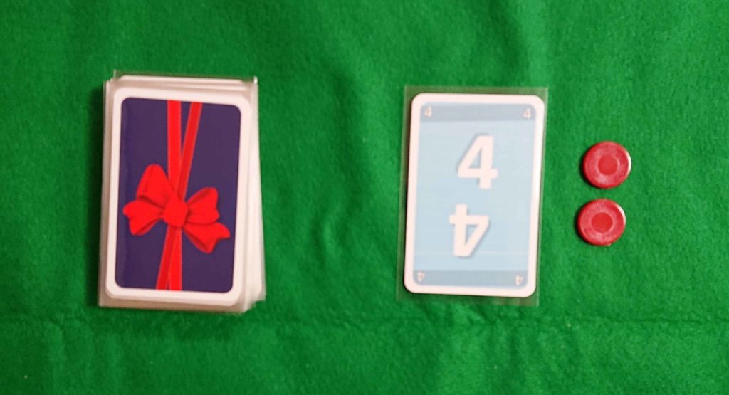 下の写真のように、2人のプレイヤーがカードを取らない場合は2枚のチップが置かれます。もし3人目のプレイヤーがカードを取った場合は、4のカードと2枚のチップを受け取ります。