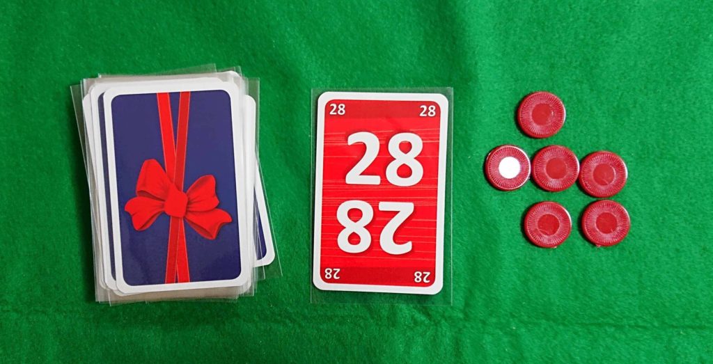 下の写真のように、28のよう数が大きいカードは、誰も受け取る人がいない状態だと、チップがドンドンたまっていきます。