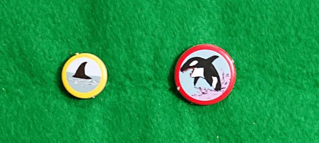 したは、シャチのチップです。黄色が1ポイント赤が5ポイントで、手札が残った場合の失点用チップとなります。