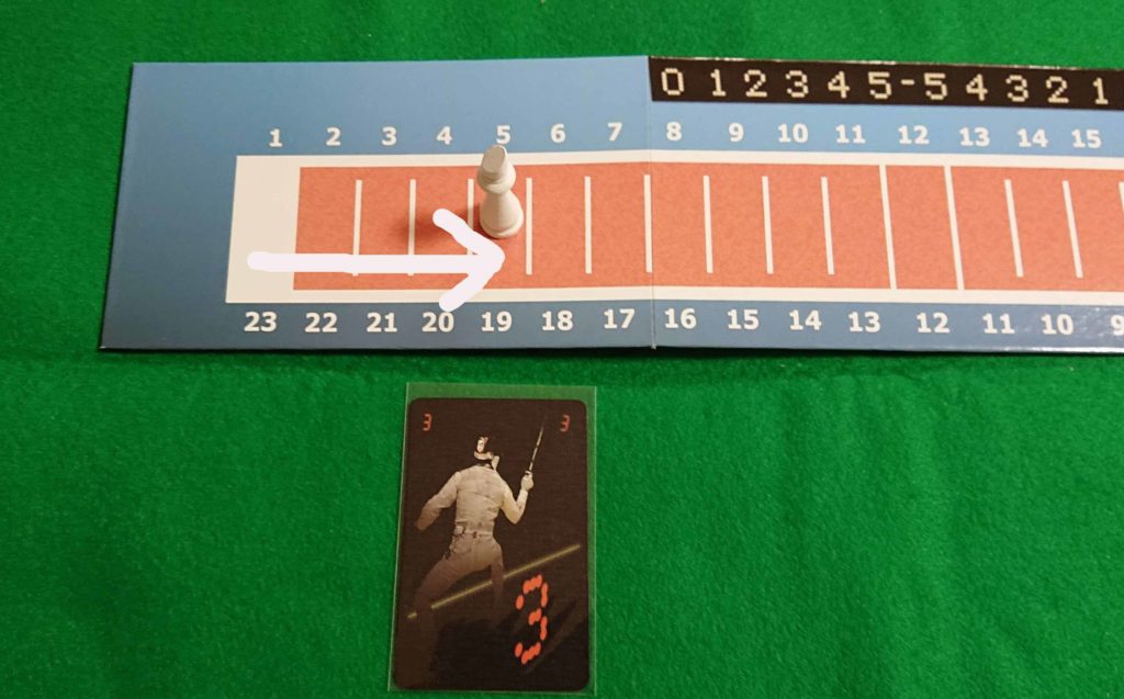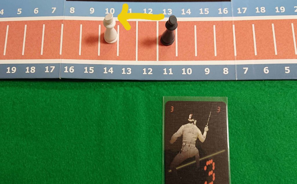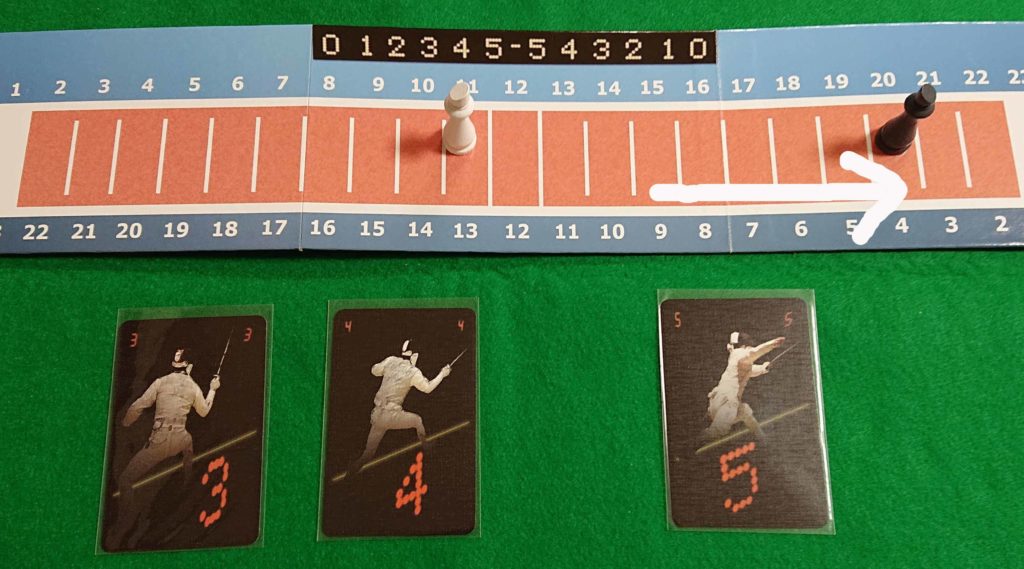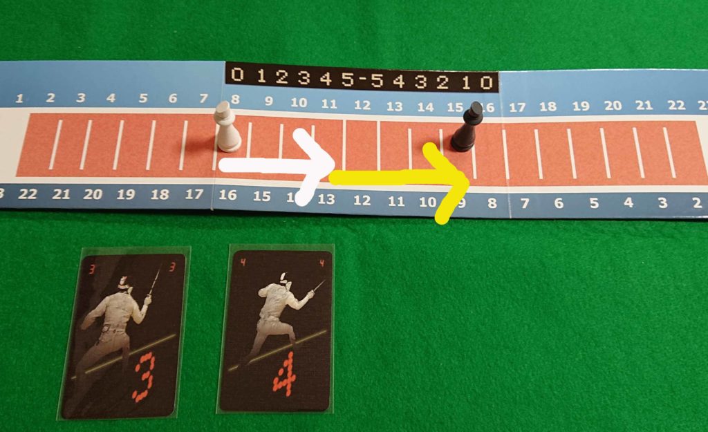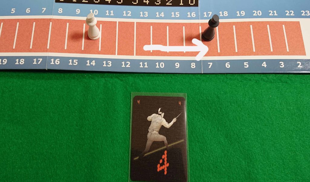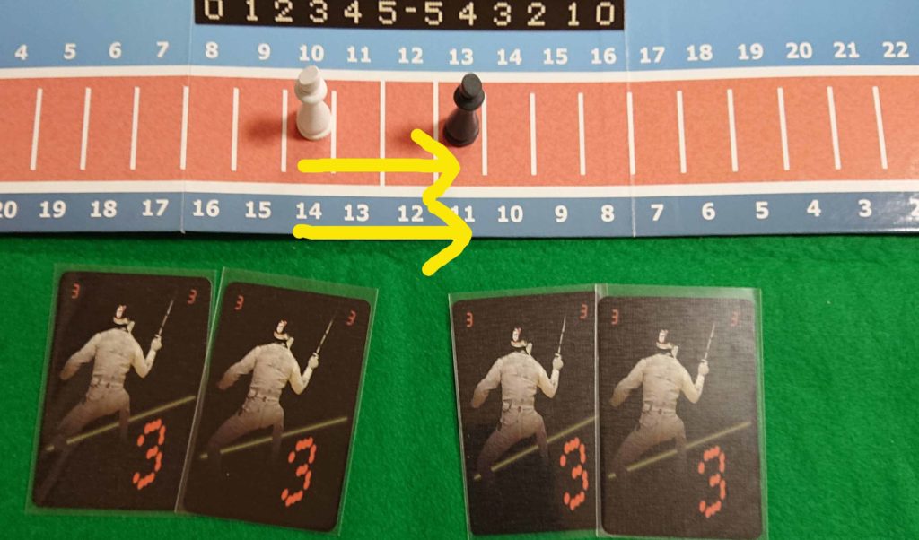 下の写真のように、3と4のカードを出して、3だけ前進し4の距離の攻撃をします。