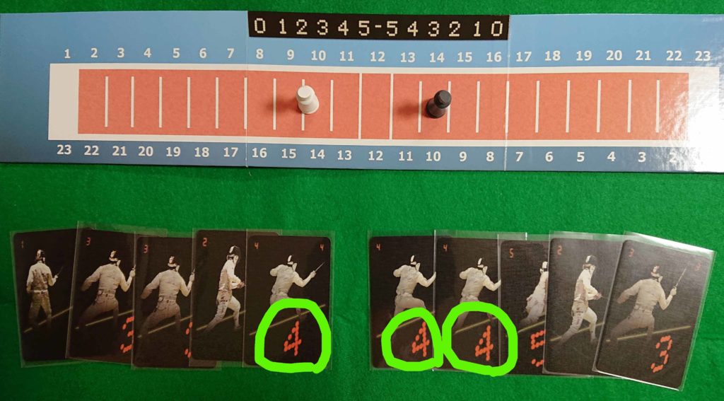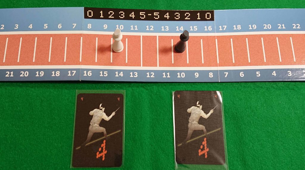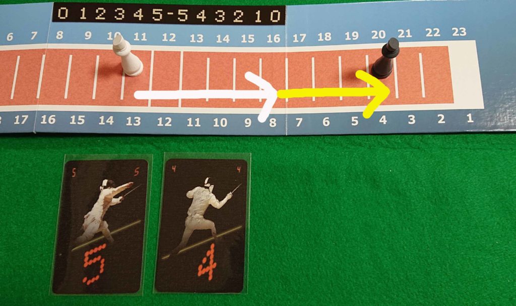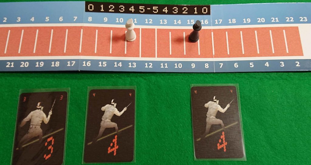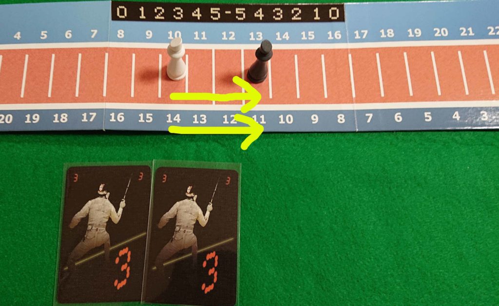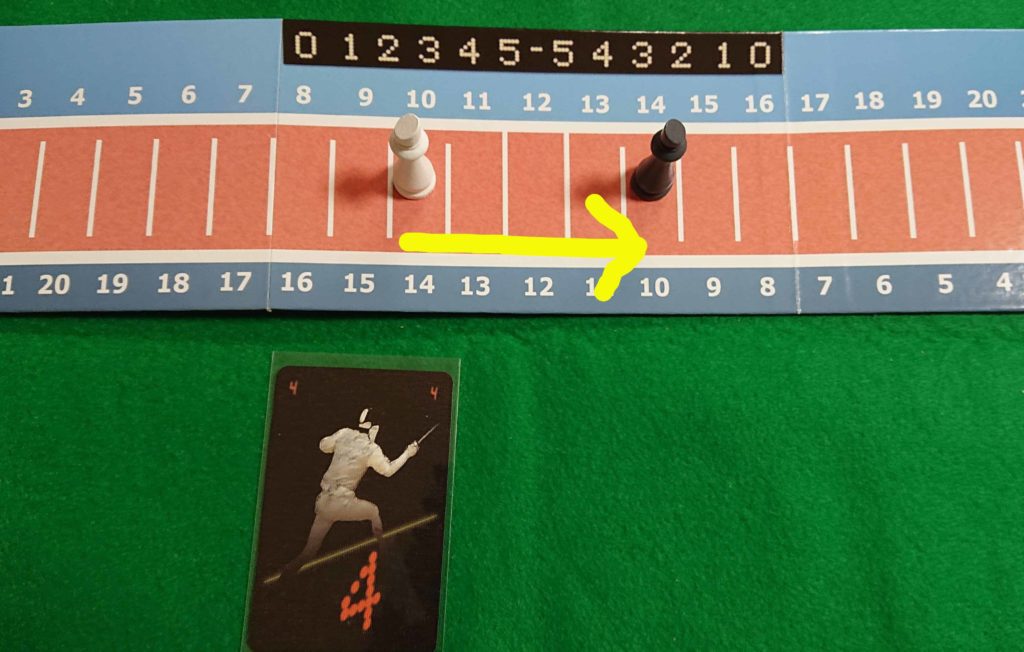 下の写真のように、3と4のカードを出して、3だけ前進し4の距離の攻撃をします。