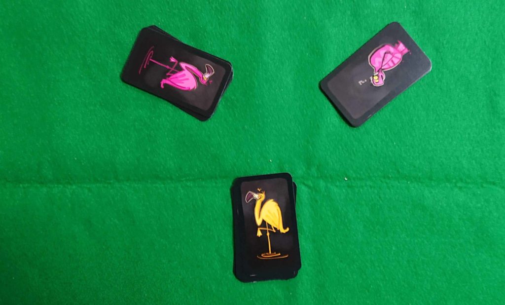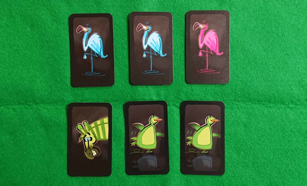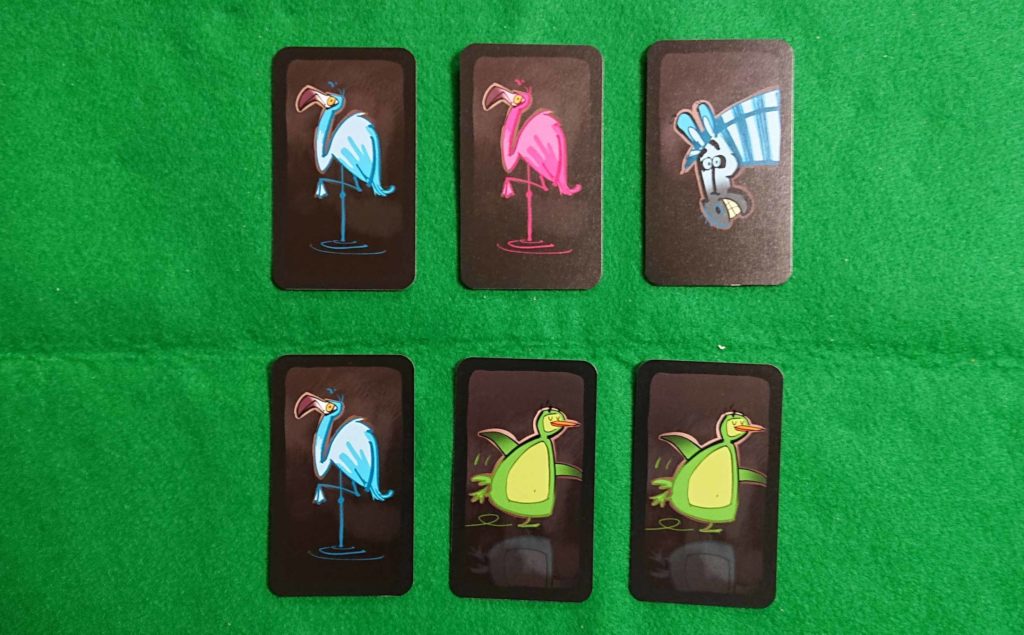 上の段は、フラミンゴ3枚・青2枚なので、「フラミンゴ」と宣言します。