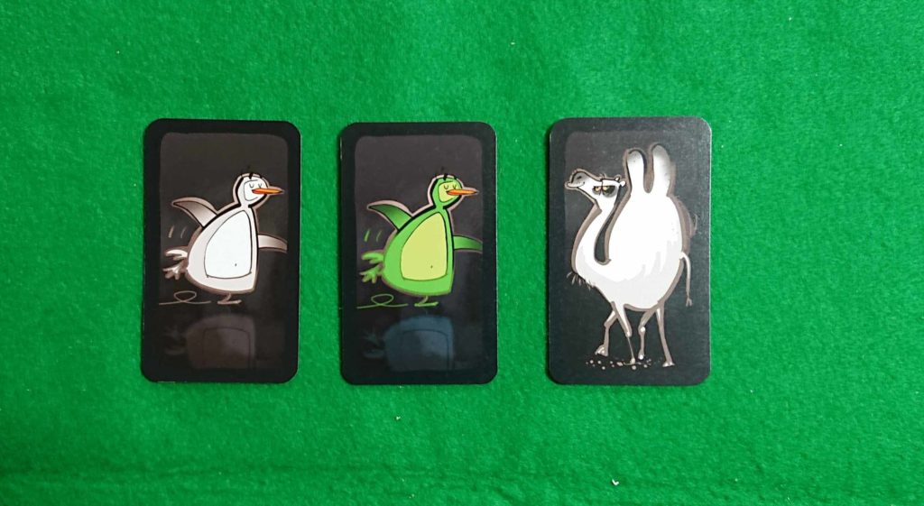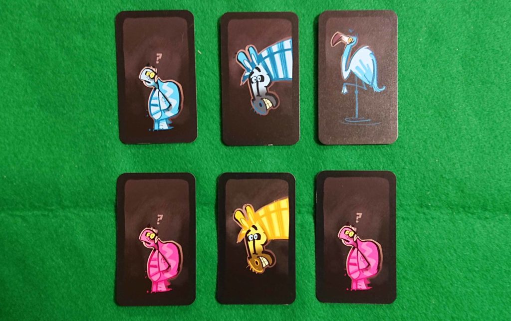 カードは、フラミンゴ・ペンギン・ラクダ・シマウマ・カメがそれぞれ5色で20枚ずつ、ワニが5枚あります。