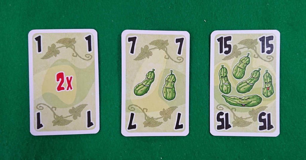 カードは1から15までが各4枚の枚です。カードにはキュウリが描かれています。数字が大きい程キュウリの数も増えます。1のカードだけ2×が描いてあります。