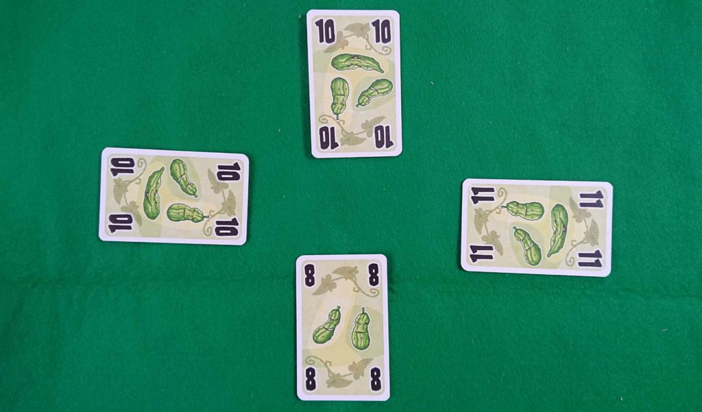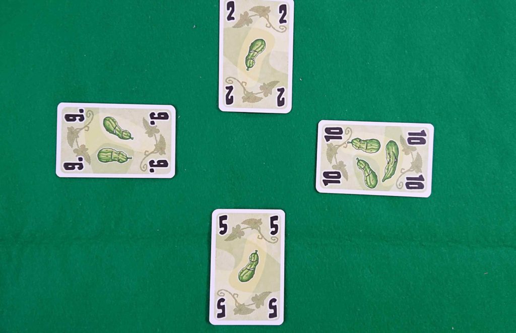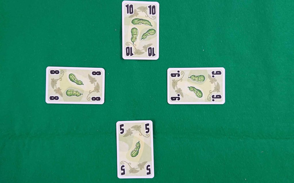 下の写真が7トリック目だとした場合、10を出したプレイヤーが、キュウリを受け取ります。