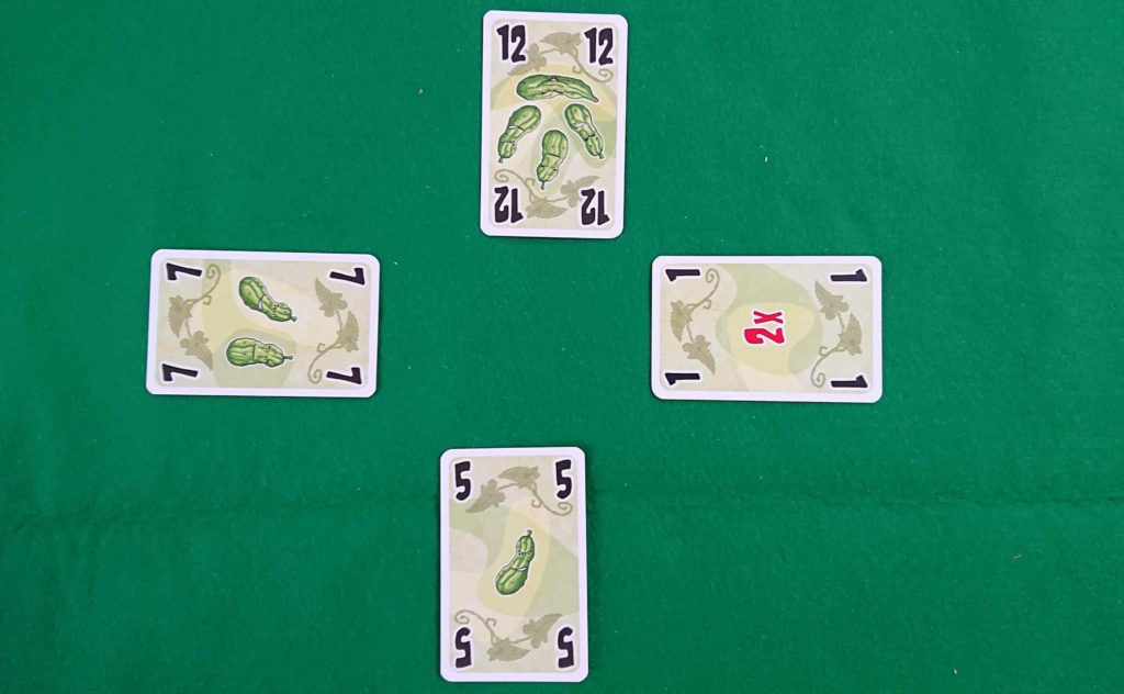 下の写真の場合は、12のプレイヤーがトリックを取ったので、4本×2=8本のキュウリを受け取り、即ゲームから抜けます。