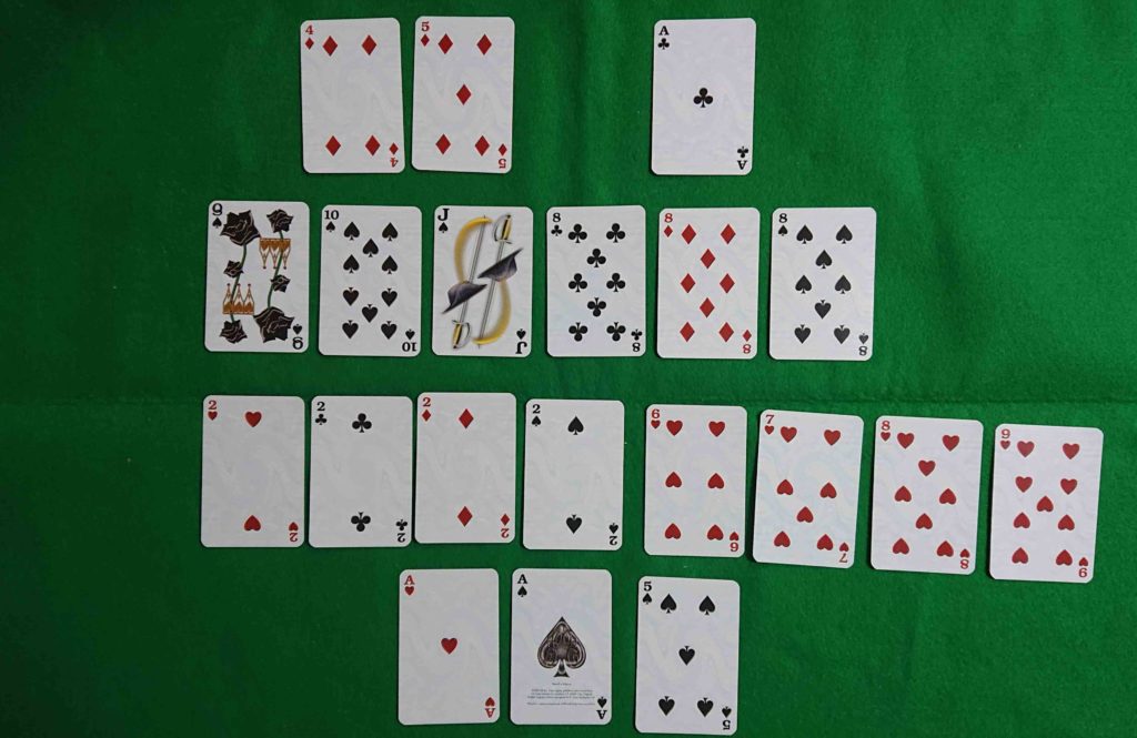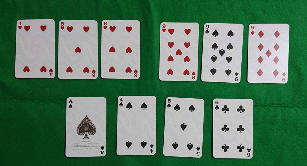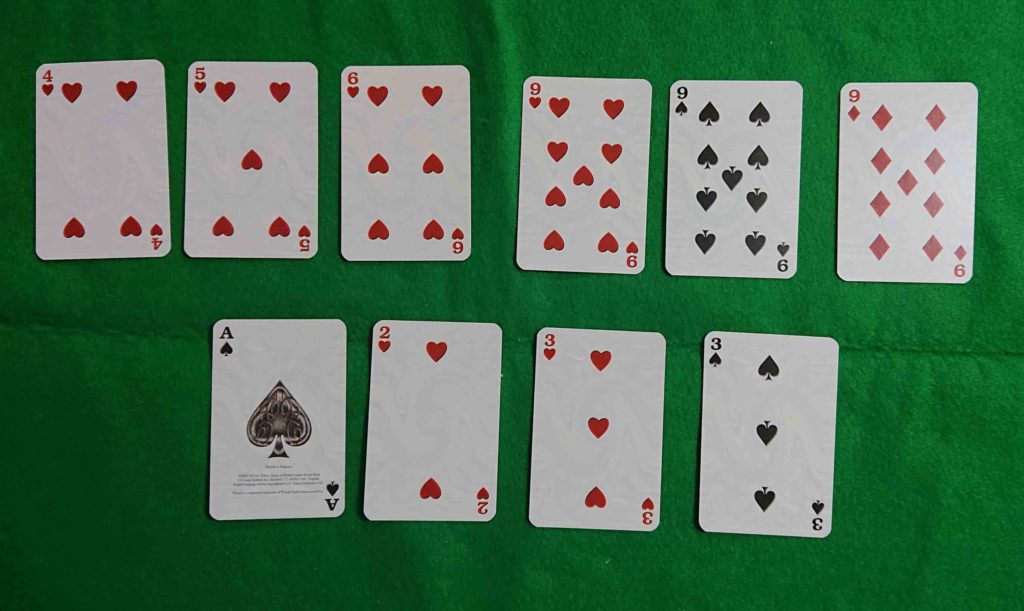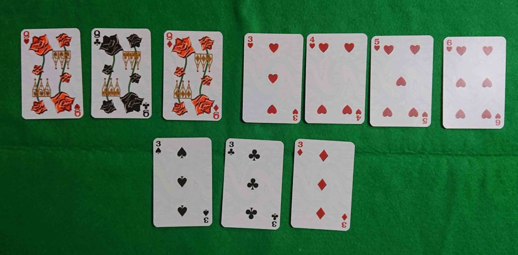 この「ジンラミー」のゲームの目的は、手札の3枚または4枚の組み合わせを作ることです。上の写真のように、組み合わせとは、シークエンス(同じスーツ(種類)の連続する数字のカード3・4枚)またはラン(同じ数字3・4枚カード)のことです。