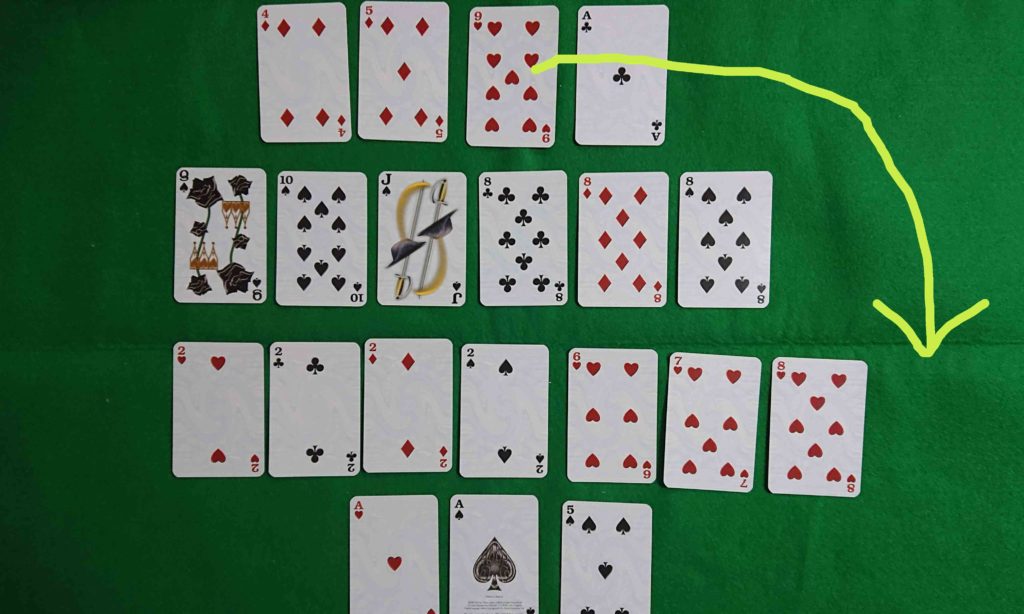 下の写真のように、ハートの9を下のハートの8の横に付け足すことが出来ます。