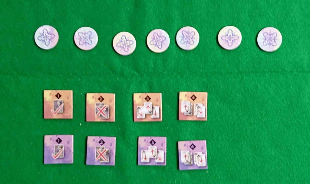 上の段は、勝利マーカー7枚、下の段はアクションタイルが4枚×2の8枚あります。アクションタイルは1から4まで4つのアクションがあります。