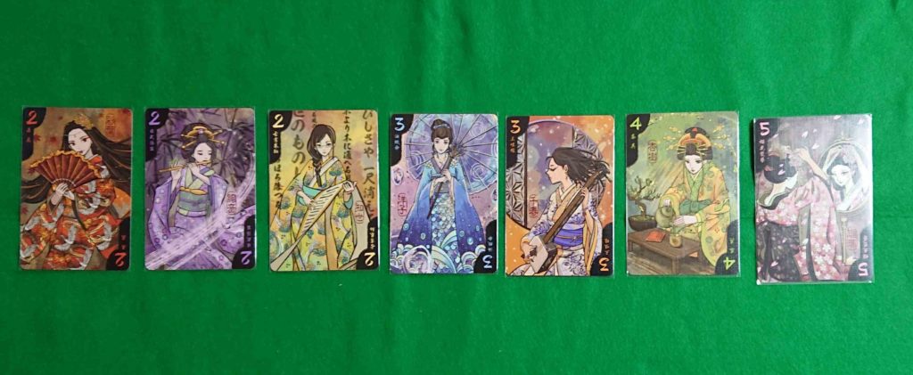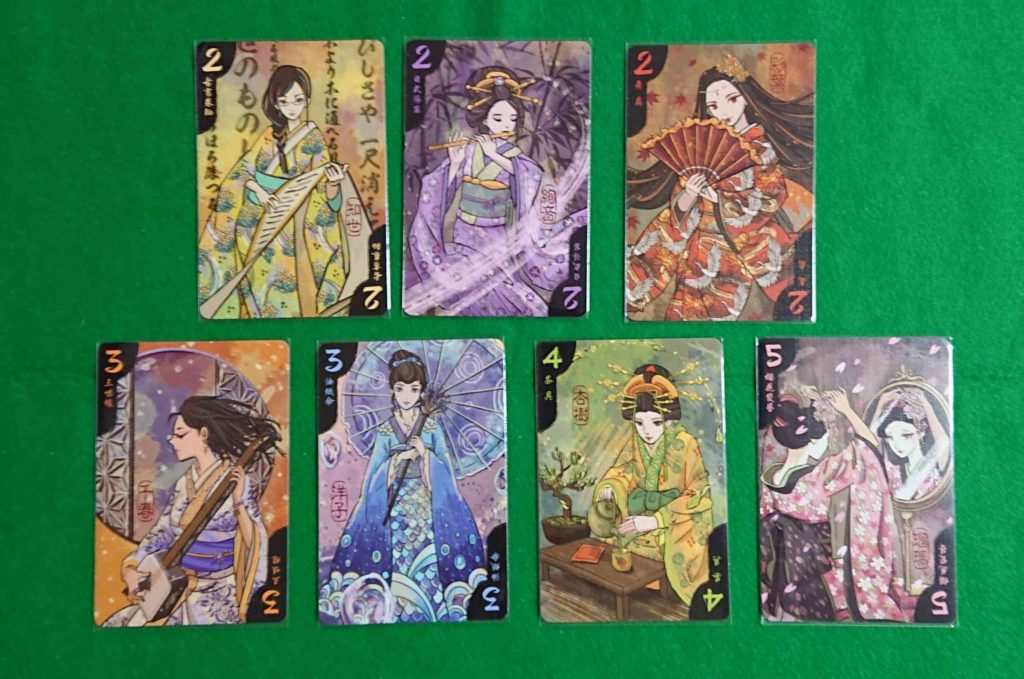 芸者カードが7枚あります。左上の数字は魅力値です。また、獲得した時の点数になります。