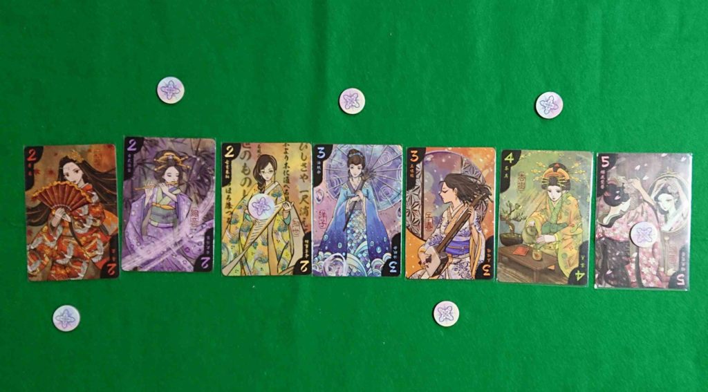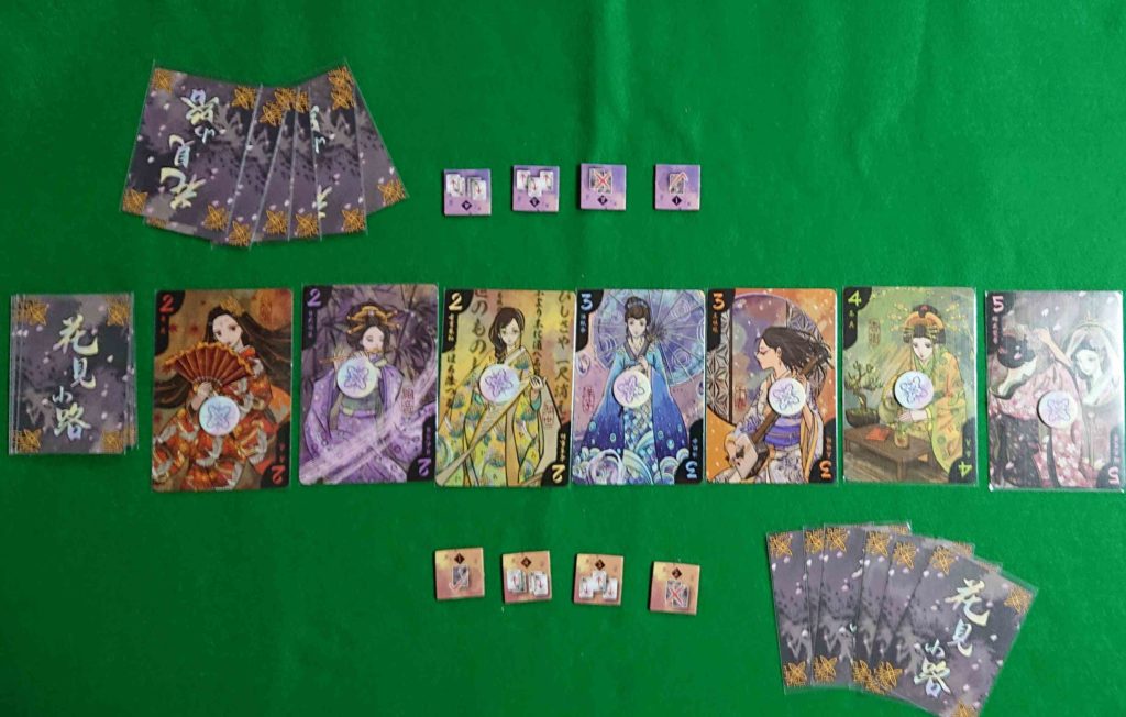 芸者カードを7枚場に並べ、芸者カードの上に勝利マーカー1個ずつ載せます。アクションチップ4枚を各プレイヤーの前に置きます。