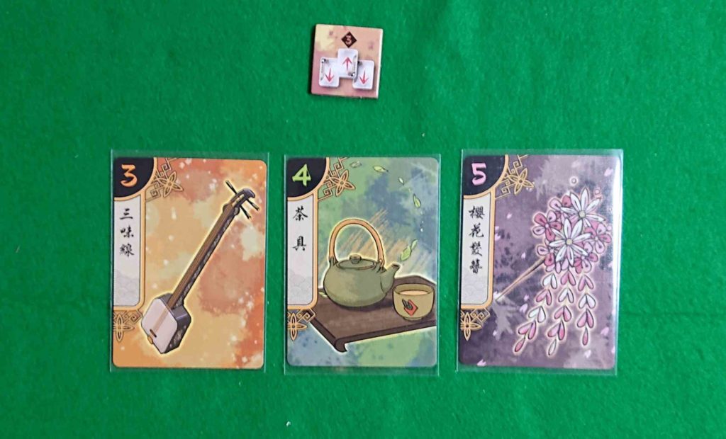 道具カードを3枚選び表にして公開します。相手プレイヤーはその中から道具カードを1枚選び、自分側の芸者カードの横に置きます。残り2枚は自分側の芸者カードの横に置きます。